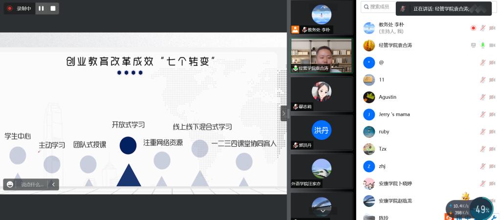 经济与管理学院教师袁合涛以“一二三四课堂协同的《创业管理》混合式教学创新与实践”为主题,结合创业管理课程的建设与发展分享了线上课程的教学设计、教学模式、创新特色与建设成效。
