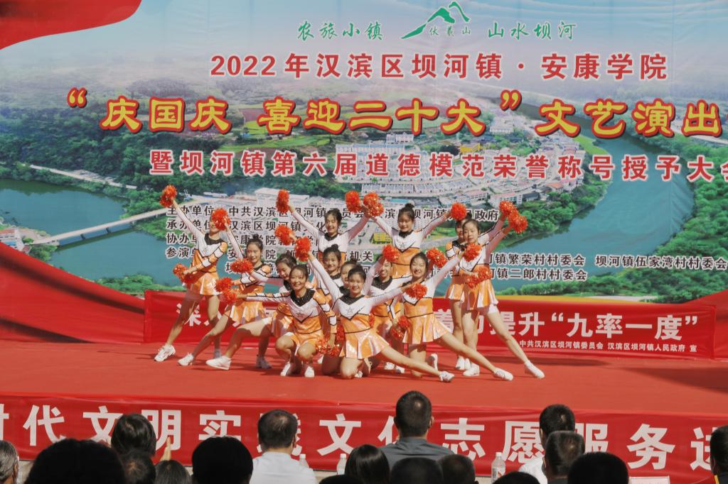在坝河镇“庆国庆.喜迎二十大”文艺演出活动暨坝河镇第六届道德模范荣誉称号授予大会上,教育学院师生表演了精心准备的《我和我的祖国》《阳光路上》《如愿》《天地在我心》等文艺节目,展示了Beat365师生扎实的专业技能和素养,同时表达了师生热爱祖国的真挚情怀,为祖国即将迎来的七十三岁生日送上一份饱含深情的祝福。
