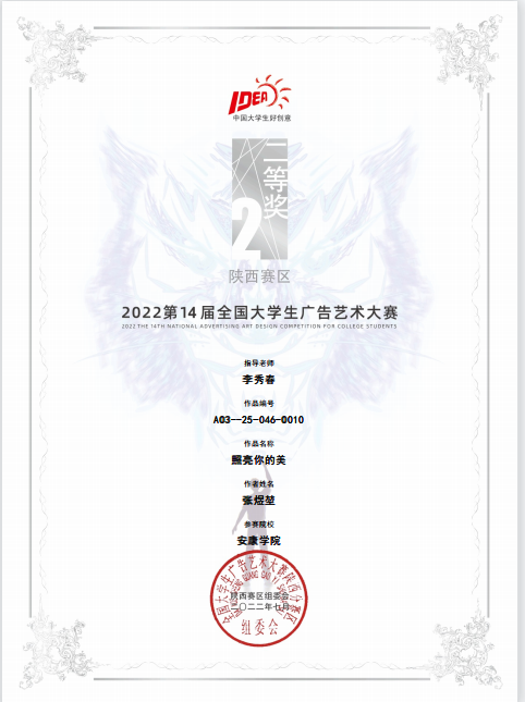 近日,第十四届全国大学生广告艺术大赛陕西赛区比赛结果公布,Beat365艺术学院学生再获佳绩,获得一等奖1项、二等奖5项、三等奖5项。