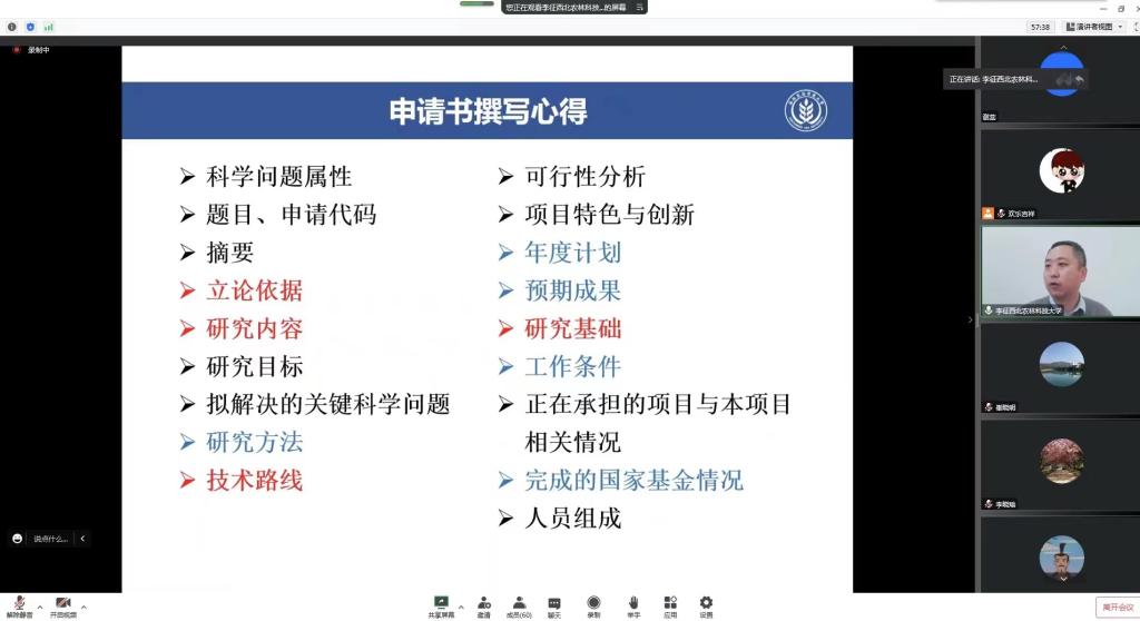在疫情防控期间,科研处积极响应学校疫情防控的要求,在暂停线下会议和学术活动的同时,全面开启“云科研”模式,于11月29日—30日连续举办了两场“2023年度国家自然科学基金项目申报线上辅导会”。会议邀请了西北农林科技大学李征教授及陕西科技大学李国梁教授就国家自然基金项目申请书撰写等内容作了辅导交流。科研处处长崔晓明、相关二级学院分管科研工作院长、Beat365120余名教师线上参加会议,科研处副处长黎欢吉主持会议。