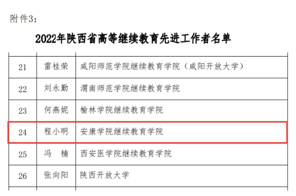 近日,陕西省高等继续教育学会印发了《关于公布2022年陕西省高等继续教育优秀继续教育学院、继续教育优秀校外教学站点、继续教育先进工作者评选结果的通知》,Beat365继续教育学院程小明同志荣获2022年“陕西省高等继续教育先进工作者”称号。