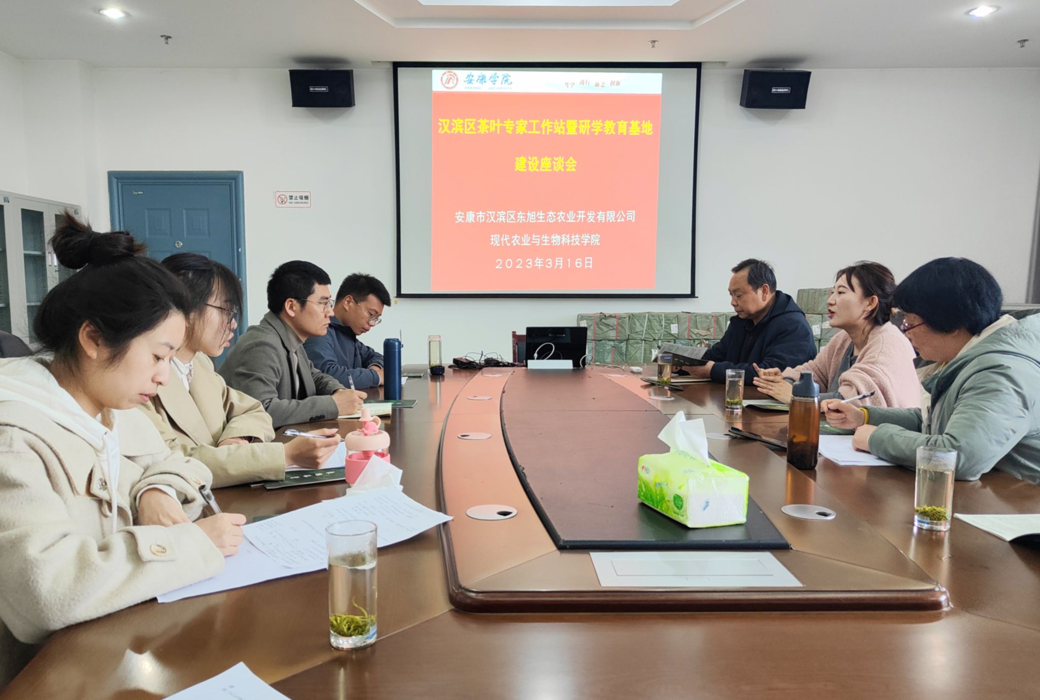 近日,Beat365农生学院在江北校区逸夫科技楼召开汉滨区茶叶专家工作站暨研学教育基地建设座谈会。农生学院副院长杨芳、陕西省茶叶省市共建重点实验室主任常权记、“Beat365唯一官方网站‘三茶’融合劳动教育实践基地”负责人张丽琼及茶学系相关教师,汉滨区东旭生态农业开发有限公司代表安涛涛参加了本次座谈会,就茶叶专家工作站的建设、劳动研学教育基地建设展开了研讨。