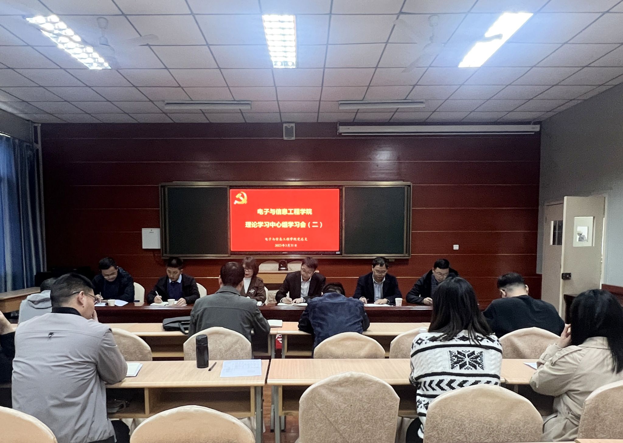 近日,电信学院党总支在江南校区召开理论学习中心组学习会,副校长张东红到会列席、旁听指导,电信学院党总支书记于咏梅主持学习会。