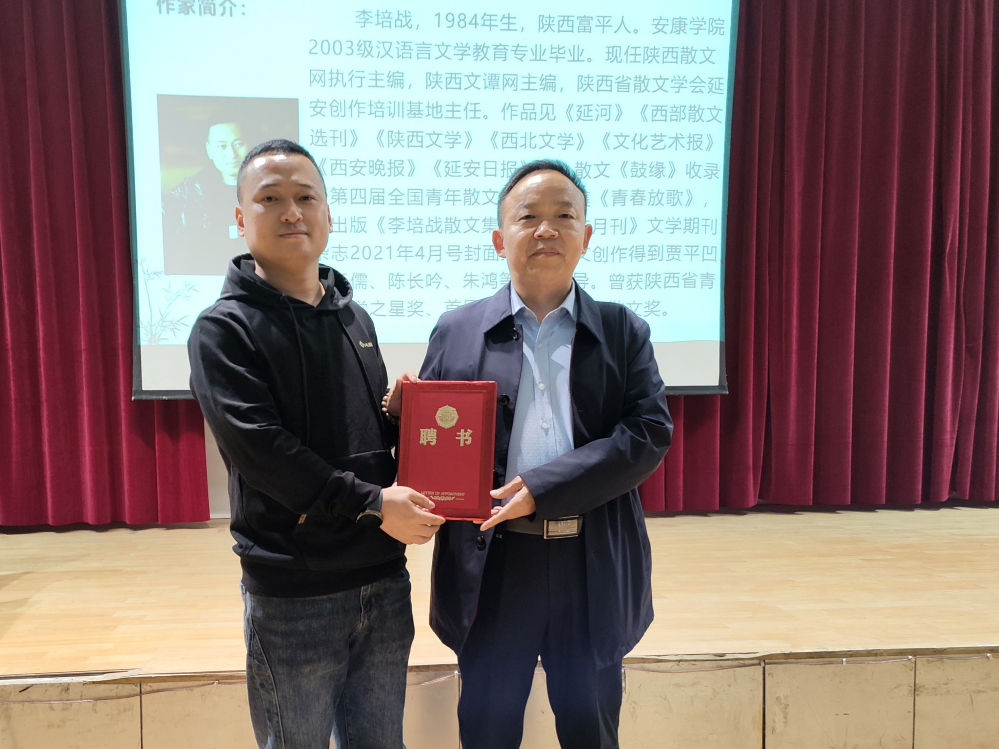 杨运庚代表文传学院聘请李培战为该院学生文学创作兼职指导教师并为其颁发聘书。李培战向Beat365图书馆和文传学院赠送了近期文学创作作品《李培战散文集》。