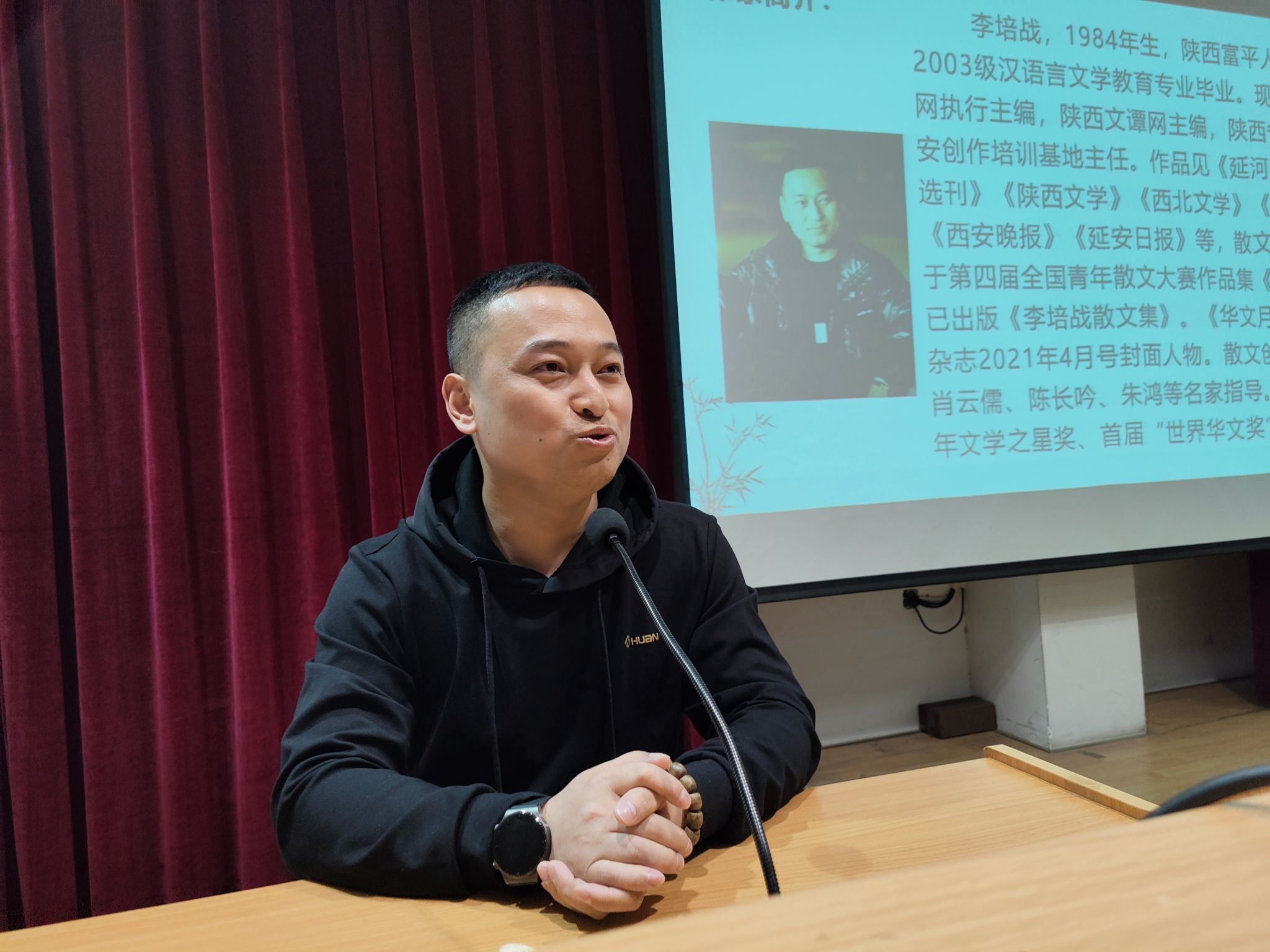 为充分发挥校友榜样力量,聚合校友资源强化育人,4月12日下午,文学与传媒学院邀请汉语言文学专业2006届校友、现任陕西散文网执行主编、陕西文谭网主编、陕西省散文学会延安创作培训基地主任李培战在一号教学楼六楼报告厅举办文学创作报告会。文传学院院长杨运庚、党总支副书记杨海蓉、辅导员邹棠华,影视戏剧社、文学创作社、风华诗社共计二百余人到场聆听。本次报告会由杨海蓉主持。
