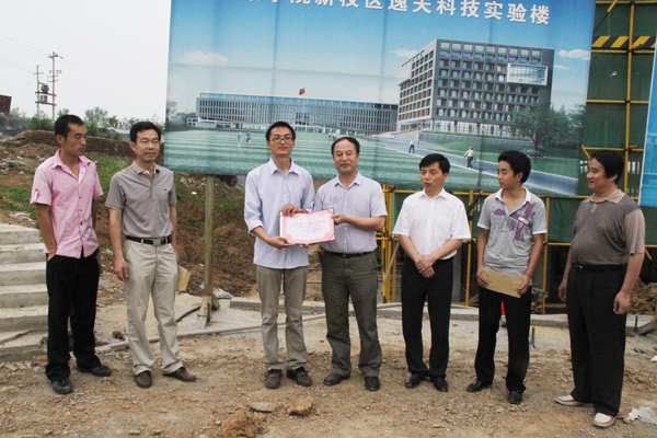 在得知三位同学的捐款想法后,学院对此十分重视。7月1日上午8:30,捐款仪式在我院新校区逸夫科技实验楼工地举行的,参加人员有学院院长王兴林,学院党委副书记胡鸿晓,学院党委副书记、纪委书记、新校区建设指挥部执行总指挥闵小平,新校区建设指挥部主任杨润波,农学与生命科学院书记屈国胜以及相关人员。仪式上,三位同学分别把500元郑重地交到王兴林院长手中,王兴林代表学院向三位同学颁发了捐款证书,他说:“‘谁言寸草心,报得三春晖’,古人讲三春晖难报,但你们的捐款,让我非常感动,我代表学院,向你们表示感谢。你们捐赠的不是一个简单的数字,而是一份情意,一份对母校真挚的赤子情意。这份情谊不是简单的500元所能衡量的,它重似千钧,给了我们更大的责任和压力,我们会把这份责任和压力转化成推进学院科学、持续、快速发展的动力。同时,从你们这份情意中,我看到的是一颗感恩社会、回报社会的责任之心,相信你们从母校走出去后,一定会有更为广阔的发展前景。”