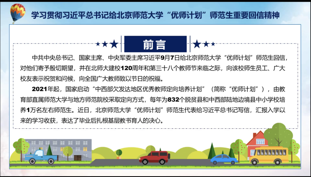 辅导员老师结合教育部党组对学习贯彻习近平总书记给北京师范大学“优师计划”师范生的重要回信精神的四项部署,即“加强中国特色教师教育体系建设;推进高素质专业化创新型教师队伍建设;促进教师资源均衡配;出台利师惠师举措”,领学了回信的内容,并结合太阳集团实际对“优师计划”以及国家对教师队伍建设的最新举措进行了介绍,对同学们未来的职业规划进行指导。