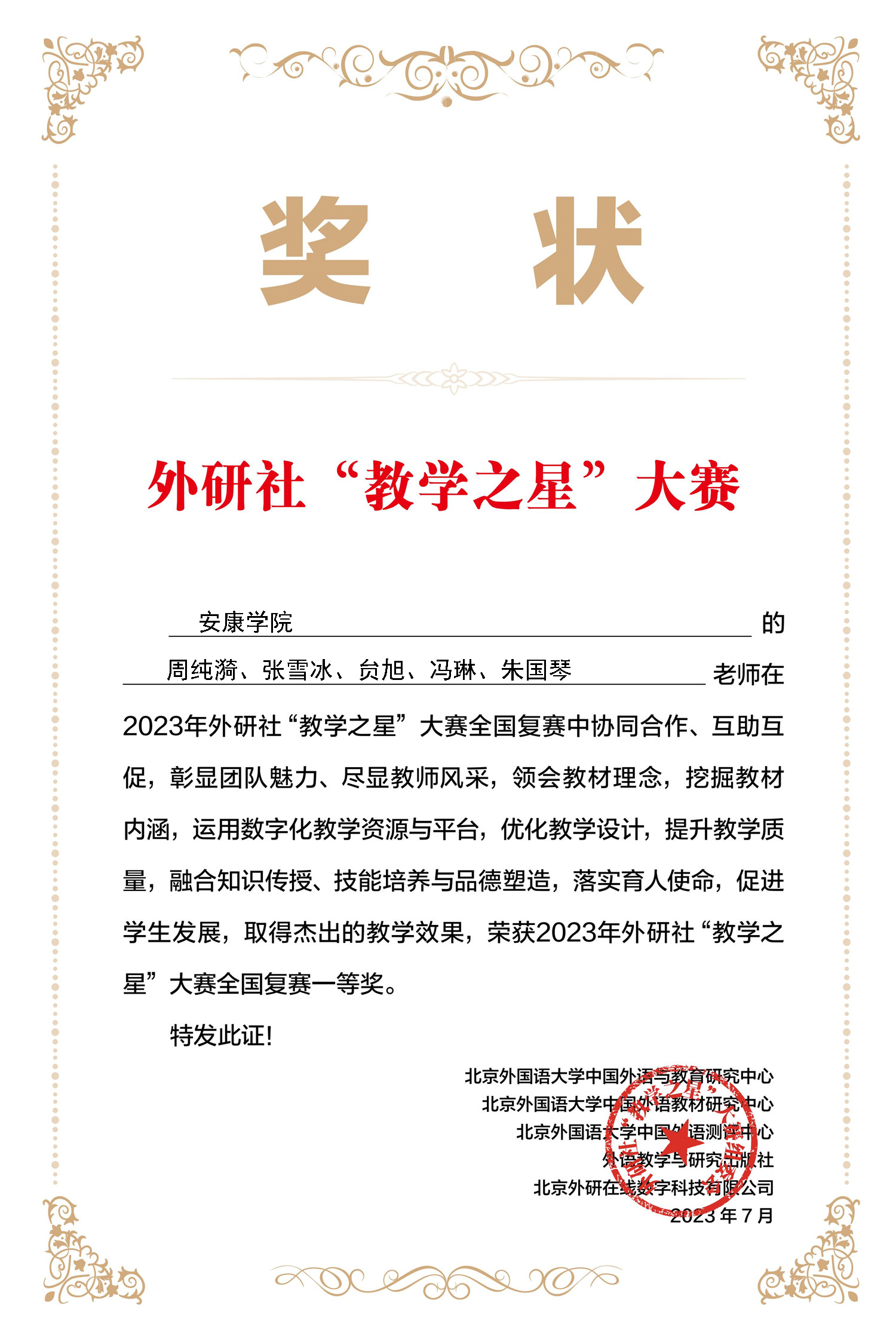近日,2023年外研社“教学之星”大赛全国复赛结果揭晓。外语学院推荐的两个教学团队在全国各高校共计655份参赛作品中脱颖而出:由周纯漪教授作为团队负责人的商务英语教学团队(成员:张雪冰、朱国琴、贠旭、冯琳)和向艳丽副教授带领的大学英语教学团队(成员:周凡雅、邓雪玲、汪家亦、钱莉)分别获得了英语专业组全国复赛一等奖和大学英语组全国复赛二等奖的好成绩。