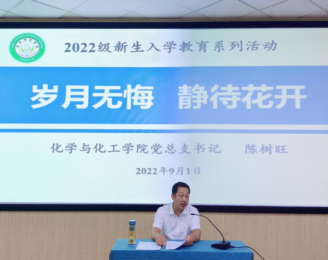 党总支书记陈树旺以《岁月无悔,静待花开》为题,向同学们介绍了学校各项规章制度,使同学们明确了纪律的重要性,树立了规矩意识。他为同学们阐述了“团结奋进,敢于争先”的化院精神,增强了同学们对学院的认同感和归属感。陈树旺针对初入大学的同学们提出了三点要求:转变角色、制定目标、开启新征程,希望同学们要珍惜宝贵的学习机会,立大志、明大德、成大才、担大任。