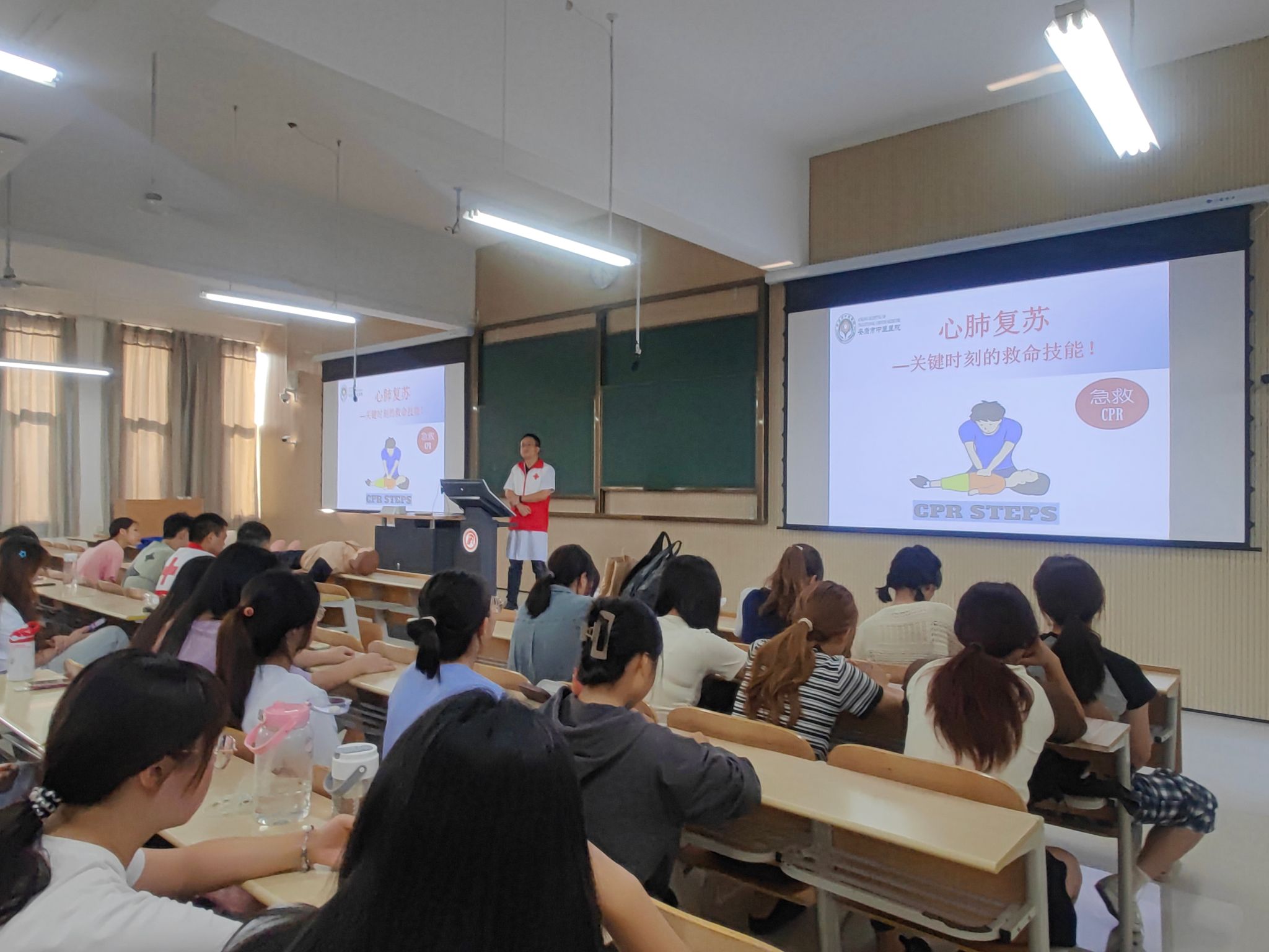 安康市中医医院高新分院主任医师、急诊科主任米俊结合自己多年临床经验及相关病例,用通俗易懂、生动幽默的语言讲述了心跳骤停的判断、心肺复苏(CPR)的方法、步骤、操作注意事项以及复苏成功的临床指征等。安康市中医医院高新分院院前急救团队结合理论讲解、操作展示、互动演练等多种方式进行了教学和演示。现场师生通过模拟人亲自体验了心肺复苏的实际操作技能。