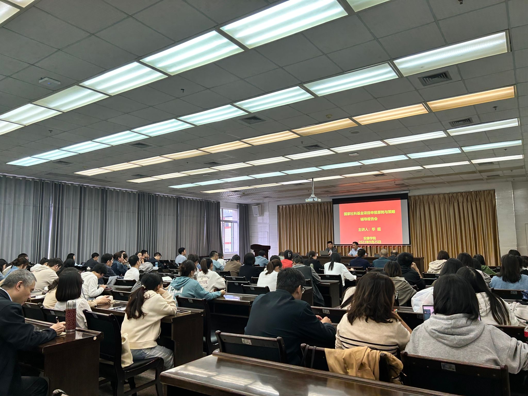 毕超副教授以“国家社科基金项目申报原则与策略”为题,介绍了近年来国家社科基金项目资助的新变化、新趋势、新特点,从申报选题到申报书撰写过程的“四大原则“、”六大策略“及相关注意事项做了专题辅导,内容详实细致。