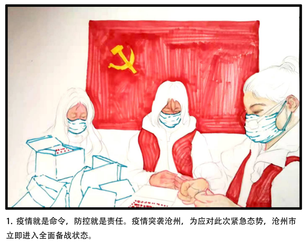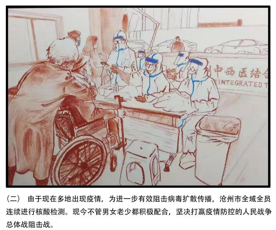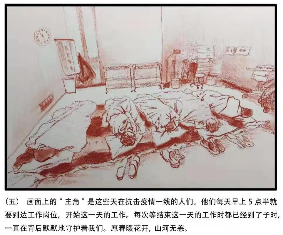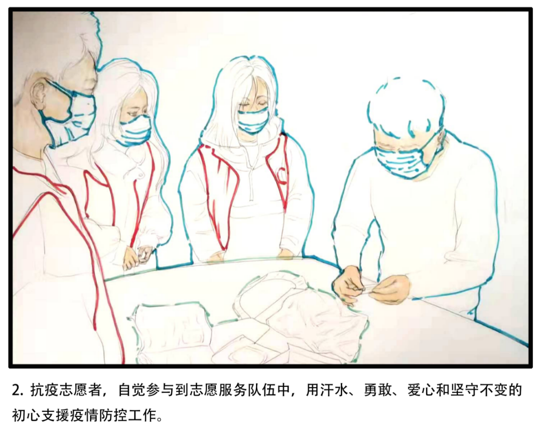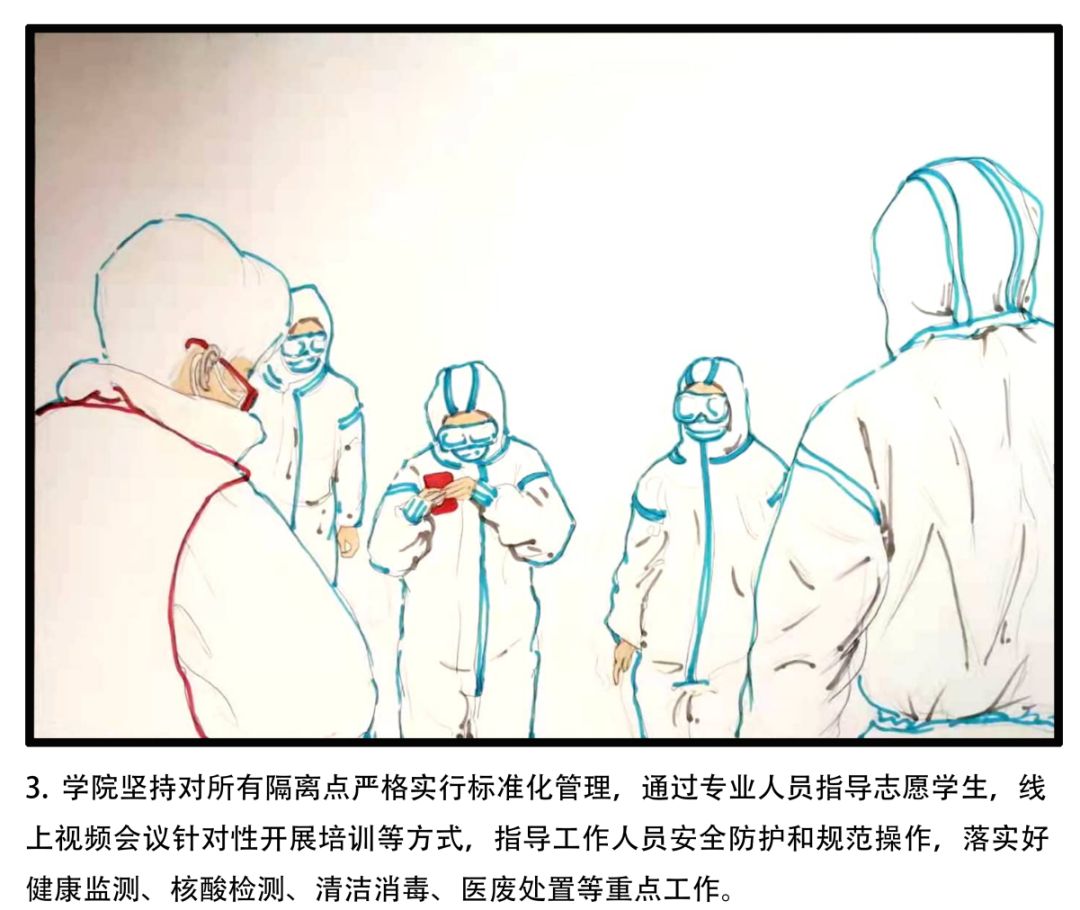 以艺术凝聚力量,以画作彰显决心。在当下共抗疫情的特殊时期,疫情防控人员舍小家为大家,以最坚毅果敢的姿态投入到这场没有硝烟的战争,与时间赛跑、与病毒斗争,全力保障在校师生的生命健康安全。美术学院教师杨帅带领2018级学生以绘画的方式,以笔为矛,化纸为盾,将抗疫的决心注入到作品之中,用行动向抗疫一线人员致以崇高的敬意,也为他们唱响最美赞歌。