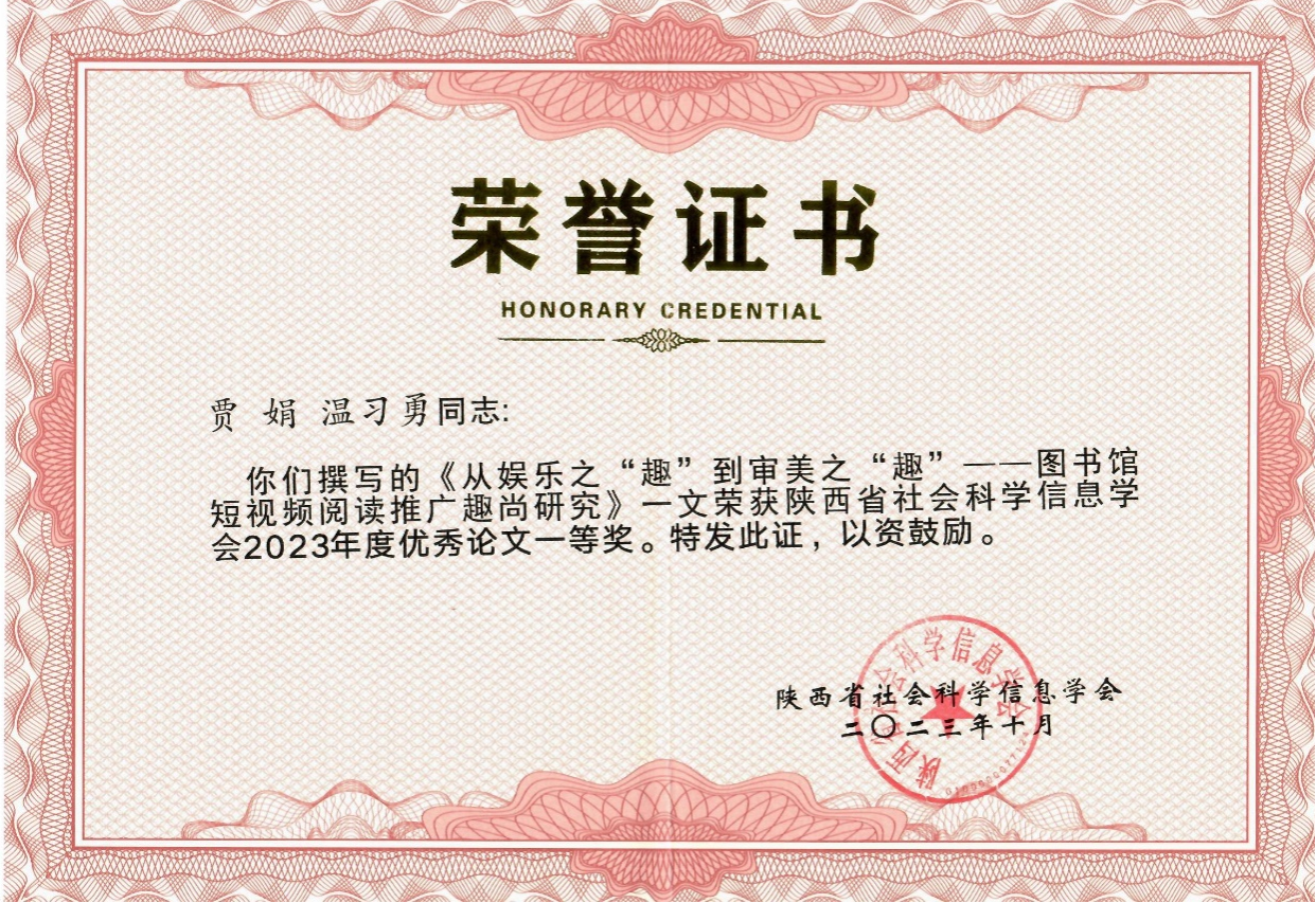 近日,2023年当代图书情报档案机构社会公益服务创新学术研讨会暨陕西省图书情报档案学术年会在西安举办。Beat365图书馆贾娟、温习勇合作完成的《从娱乐之“趣”到审美之“趣”——图书馆短视频阅读推广趣尚研究》获“2023年陕西省图书情报档案学术年会优秀论文一等奖”。