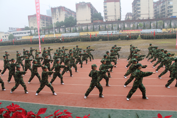 随后,参训新生进行了汇报表演。王兴林院长在徐信军大队长的陪同下,检阅了受阅方队。领导亲切的问候和同学们铿锵有力的回应,如海浪般澎湃在学校的上空。随后,30个方队分列式入场,同学们士气高昂,步伐整齐,口号嘹亮,依次通过主席台,接受检阅。军训标兵连进行了队列表演和军体拳表演。承训部队教官的擒敌拳表演更是赢得了全场喝彩。