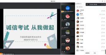 期末考试即将到来,12月1日,外国语学院组织22级全体学生在线上召开了诚信教育会议。外国语学院党总支书记陈蕊、院长王娜、党总支副书记刘文慧和21级、22级辅导员老师参加。