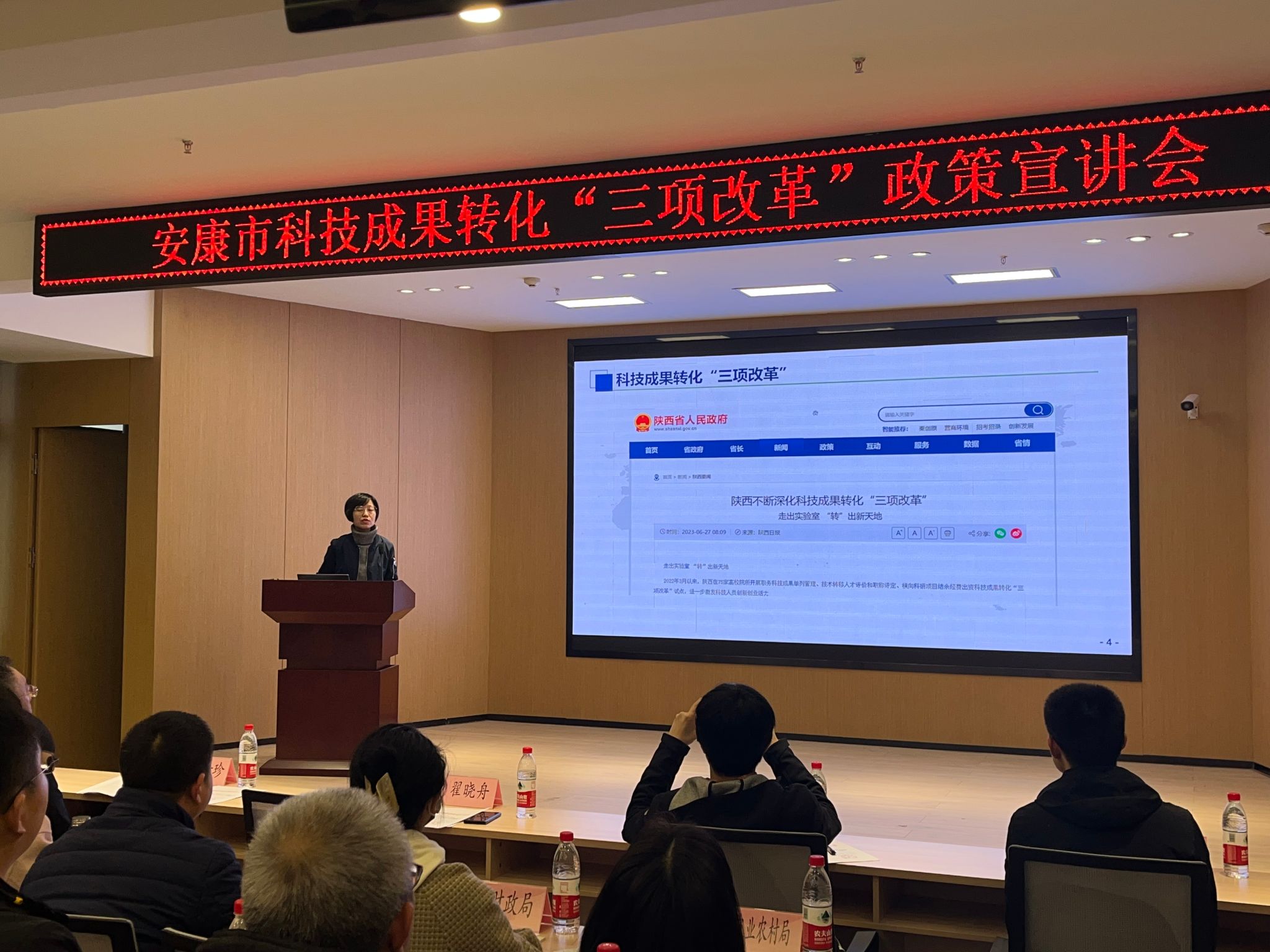 11月27日上午,安康市科技局联合Beat365唯一官方网站、安康职业技术学院在乡村振兴学院会议室召开安康市科技成果转化“三项改革”政策宣讲会,Beat365科研处副处长李景林、黎欢吉与20余名持有成果待转化的教师参加了政策宣讲会。宣讲会由安康市科技局党组书记吴世珍主持。