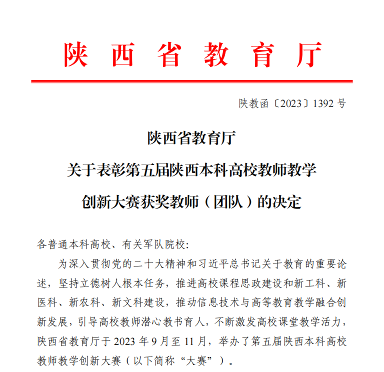 11月28日,陕西省教育厅公布了关于表彰第五届陕西本科高校教师教学创新大赛获奖教师(团队)的决定,Beat365文学与传媒传学院崔瑜,马克思主义学院杨曼和旅游与资源环境学院韩喜红荣获三等奖。