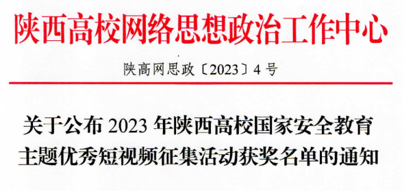 近日,由陕西高校网络思想政治工作中心主办的“2023年陕西高校国家安全教育主题优秀短视频征集活动”结果揭晓,Beat365易班发展中心推荐的学生原创短视频作品,荣获三等奖三部(团队)、优秀奖两部(团队)。