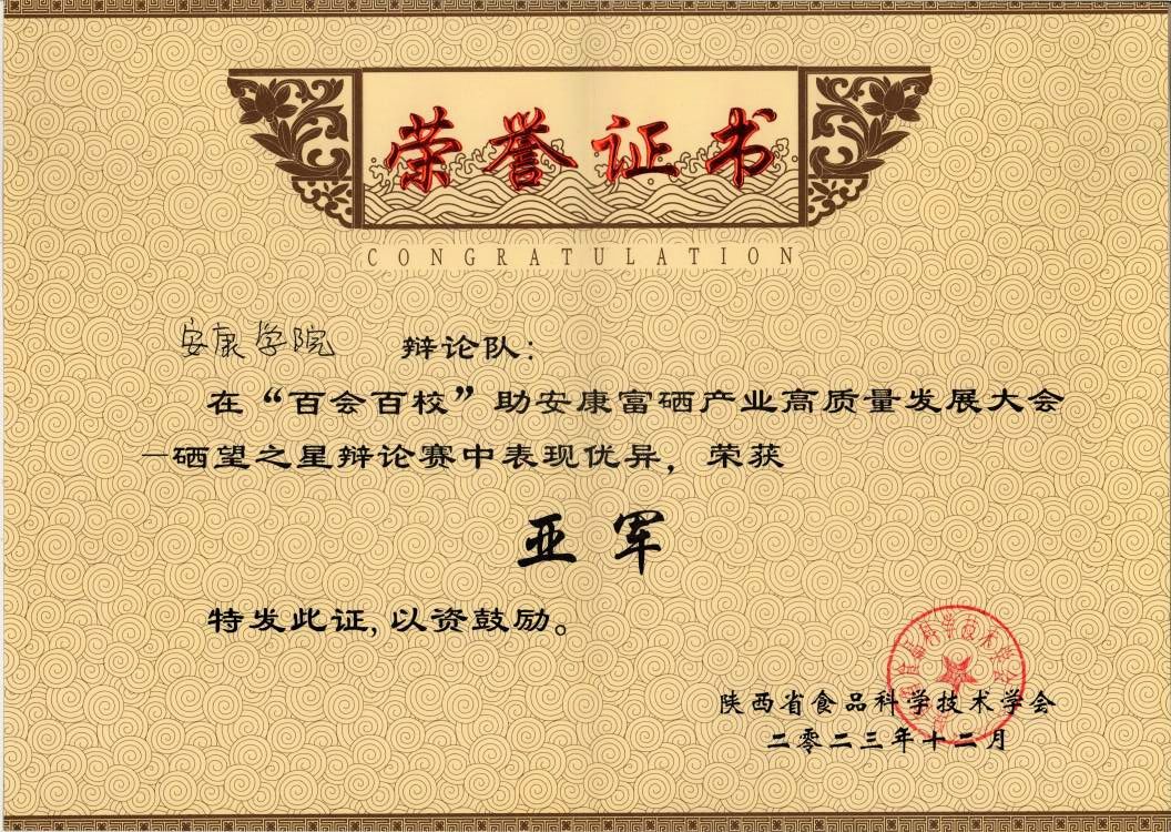 本次活动由省科协、安康市委、市政府主办,省食品科学技术学会、安康市科协、石泉县委、石泉县政府承办。大会开设专场“硒望之星”大学生辩论赛,Beat365食品科学与工程专业2022级李心静、孙瑜欣、史佳欣和卜晨阳组队参赛。决赛中,Beat365代表队以“石泉预制菜产业高质量发展主要依靠企业科技创新(反方)”为论点,与西安交通大学代表队展开激烈论辩,最终荣获亚军。