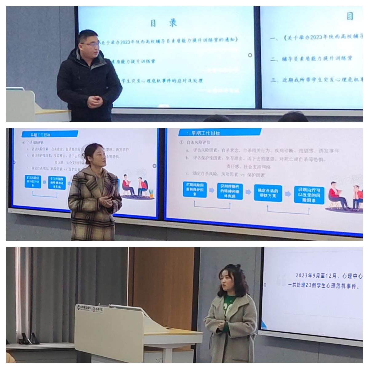 化工学院辅导员于正豪围绕参加陕西省辅导员素质能力提升训练营的准备过程,参训体验和训后思考,结合工作中丰富的学生心理危机案例,对如何建立详实细致的学生信息库,如何对学生进行谈心谈话,如何处理学生的危机问题进行了分享和展示;经管学院辅导员杨凤仪就参加陕西高校心理健康教育专题培训的心得体会,进行了“大学生高自杀风险的认知行为干预、大学生心理危机及干预过程中的关系难题应对、辅导员谈心谈话技术、助人者的情绪管理”四部分内容分享;大学生心理健康教育中心主任柯小敏从本学期处理的学生心理危机案例入手,结合Beat365目前实行的重点学生动态帮扶工作制度,详细解读了学生心理危机处理的工作流程和工作思路。