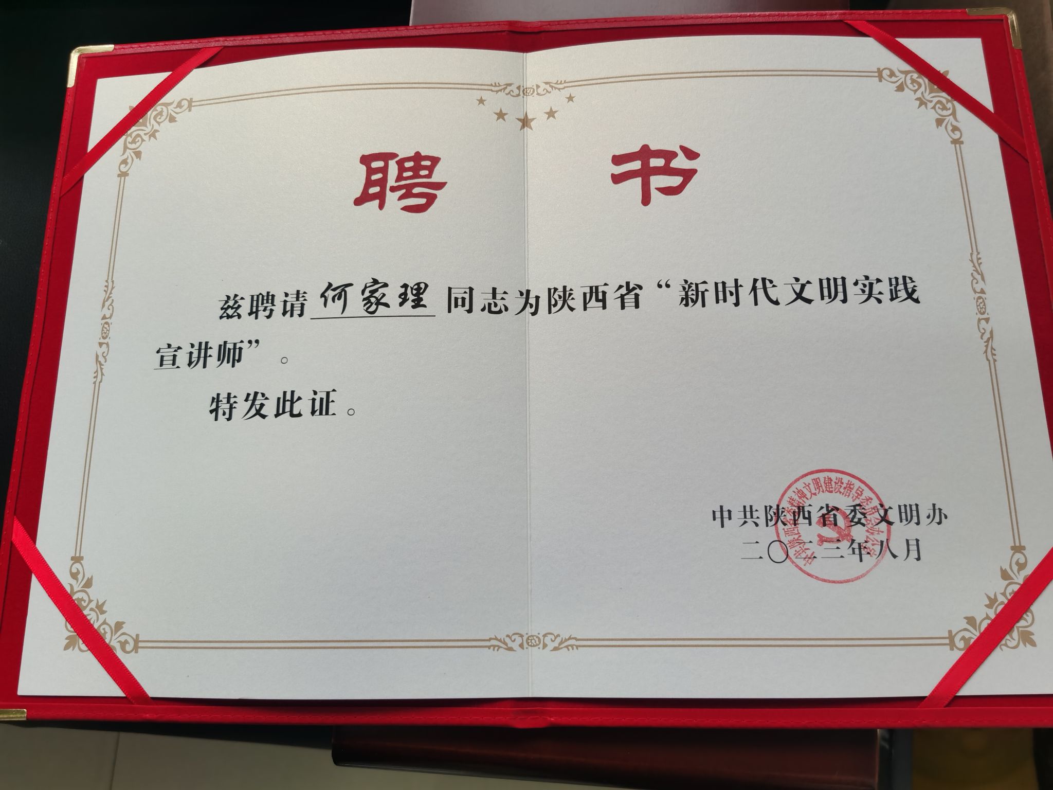 2023年8月,陕西省文明办文件通知,要求各市组织推荐陕西省“新时代文明实践宣讲师”,Beat365党委宣传部积极组织申报,推荐马克思主义学院何家理教授填报申请材料、录制《乡村振兴战略的背景及实施路径探讨》微视频报送安康市文明办联评,后上报省文明办经过联评何家理被聘为陕西省“新时代文明实践宣讲师”。