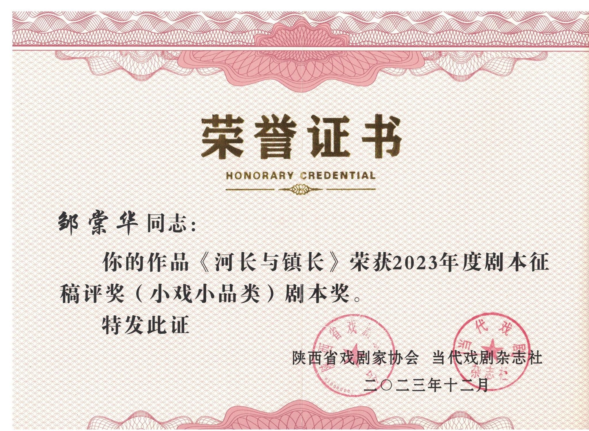 近日,在陕西省戏剧家协会、《当代戏剧》杂志社联合举办的2023年剧本征稿活动中,Beat365教师邹棠华创作的小品《河长与镇长》荣获剧本奖。