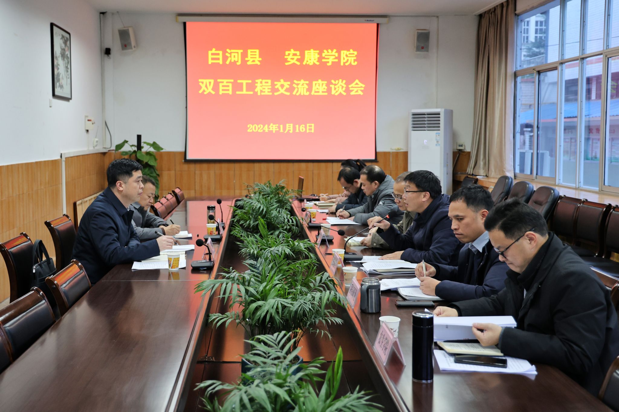 1月16日下午,白河县委副书记、常务副县长丁辉,白河县教体科技局局长谢文生一行来校交流座谈“双百工程”帮扶工作,座谈会在江南校区第一会议室召开。学校党委书记丁巨涛、党委副书记张东红、统战部、科研处、“双百工程”工作队、农生学院相关负责人参加了座谈会。张东红主持会议。