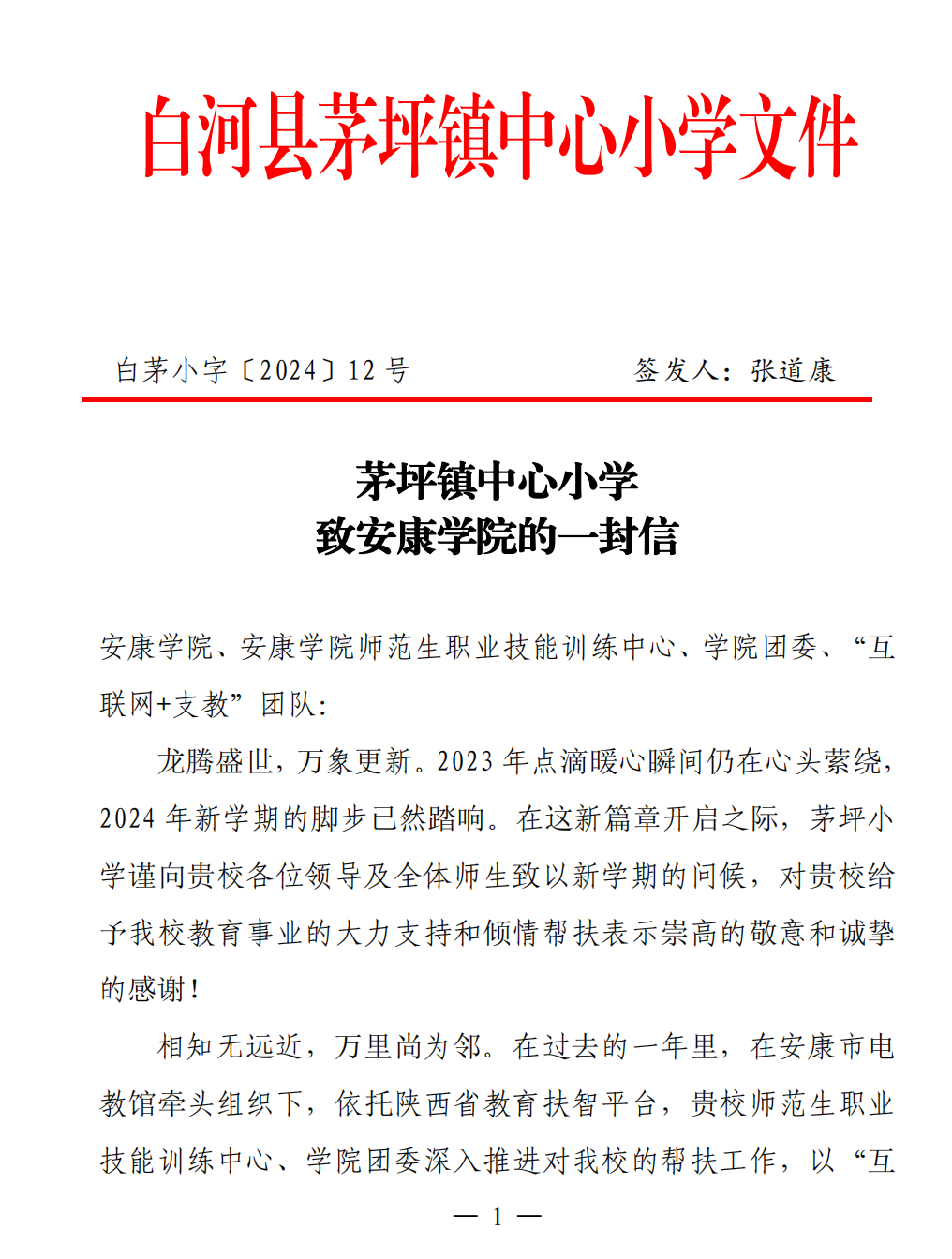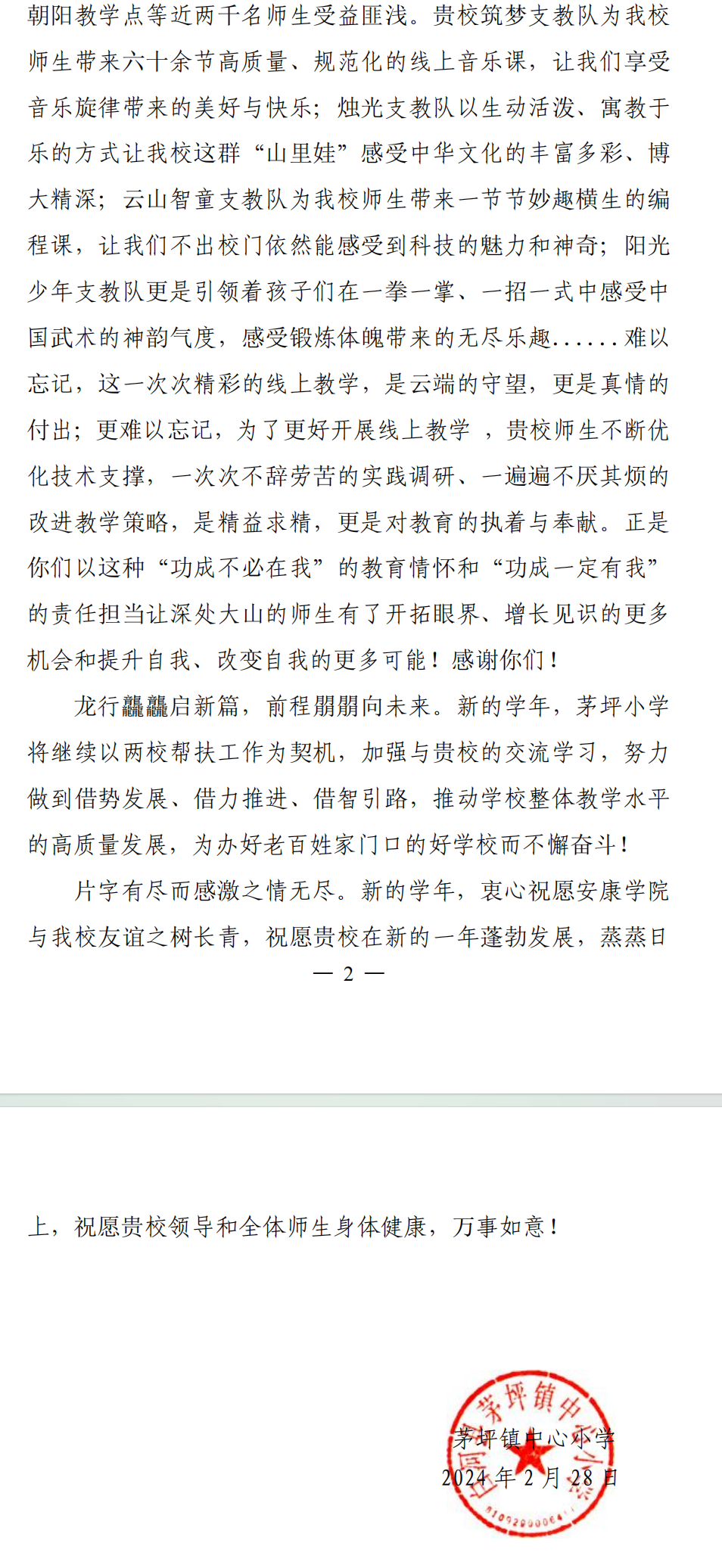 2月28日,白河县茅坪镇中心小学向Beat365致感谢信,对Beat365过去一年内通过“互联网+支教”活动对该校开展的教育帮扶表示诚挚的谢意。