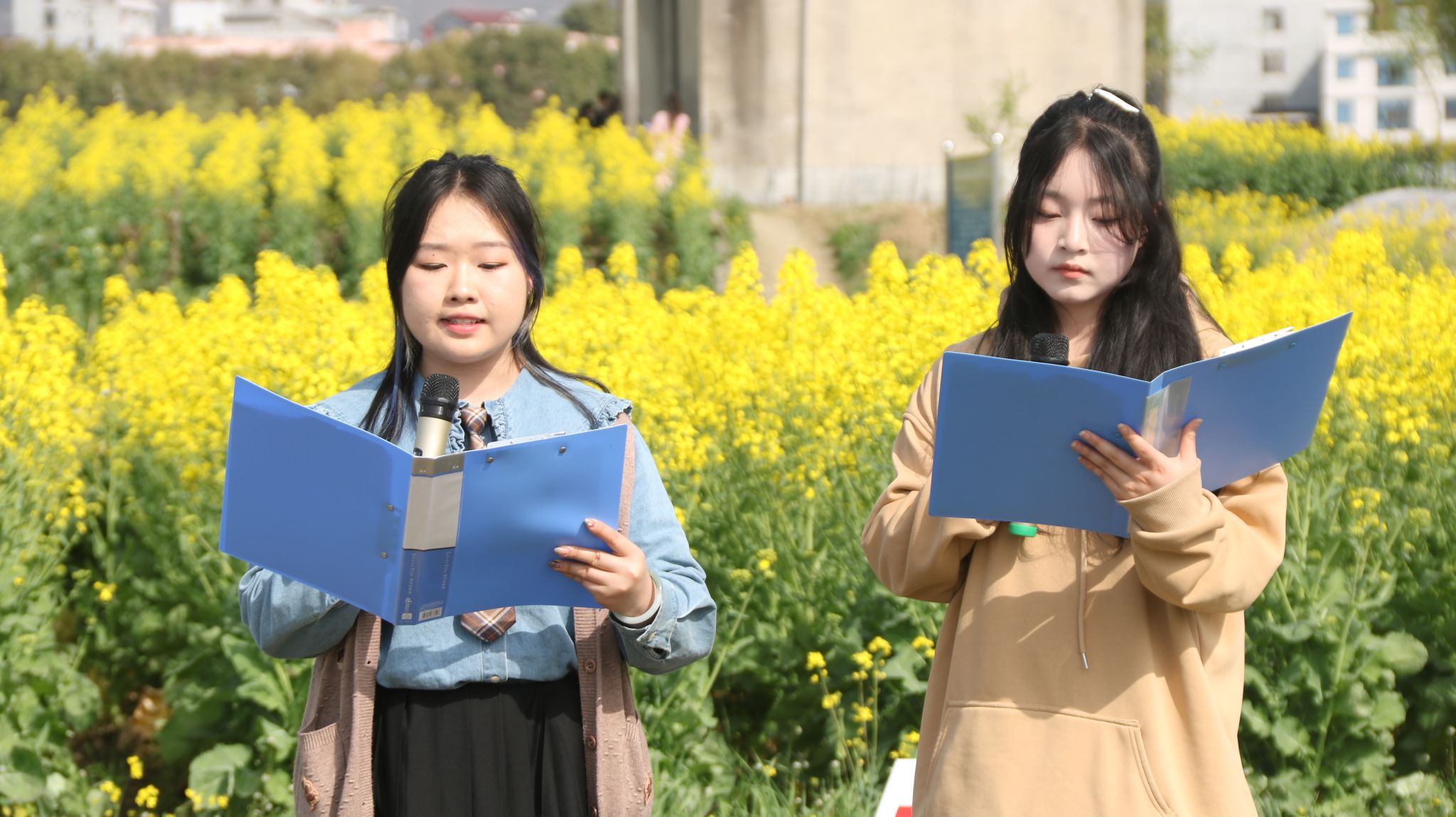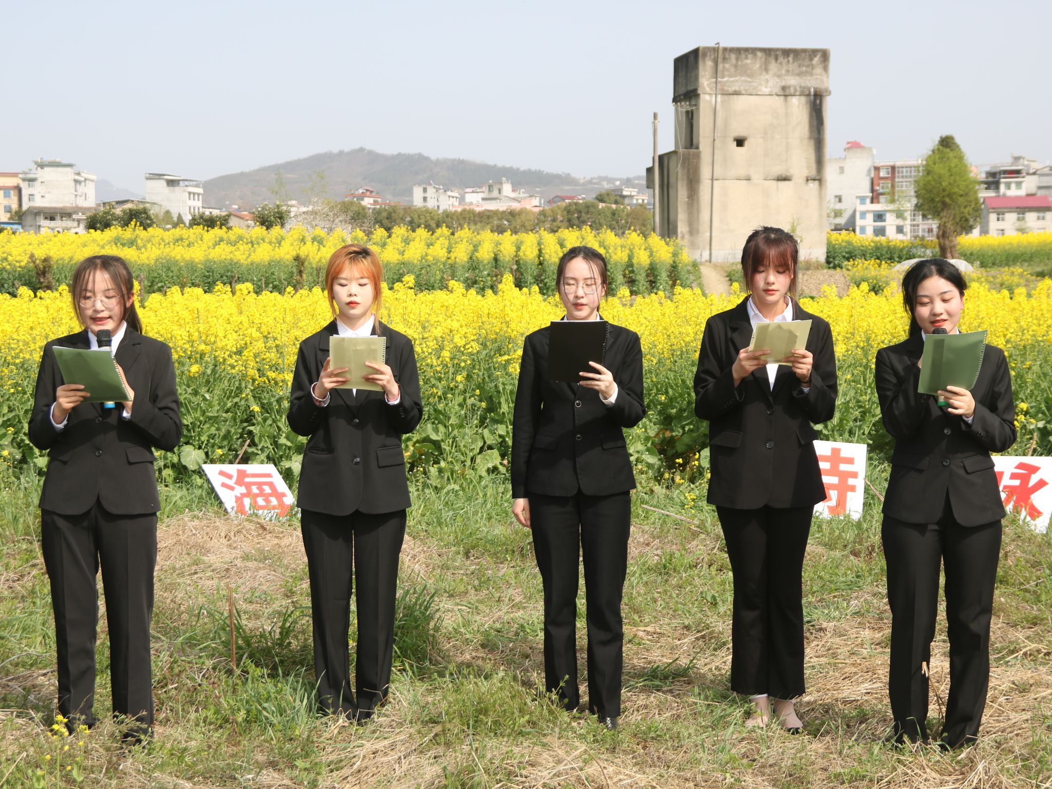 本届迎春诗歌朗诵会从2月下旬筹备启动,经过预赛选拔,最终有16组60余名同学参加决赛。本届诗歌朗诵会由影视戏剧社承办,文传学院党总支副书记杨海蓉,播音主持社、语言文字社社团指导教师黄治强、曹璇璇担任评委。在田园花海中,同学们满怀深情歌咏祖国、歌咏新时代,歌唱青春,畅想美好生活。