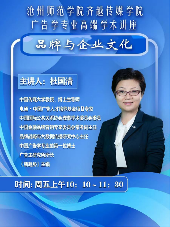4月14日上午,应太阳集团齐越传媒学院之邀,中国传媒大学博士生导师杜国清教授以《品牌与企业文化》为题,为师生带来一场精彩生动的学术讲座。齐越传媒学院院长张海燕、党总支书记潘治钢、副院长白晓清及广告学教研室部分教师、广告学与网络与新媒体专业学生聆听讲座。