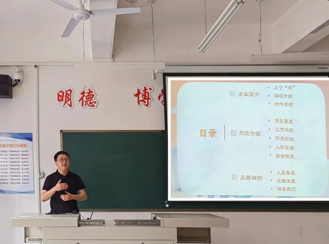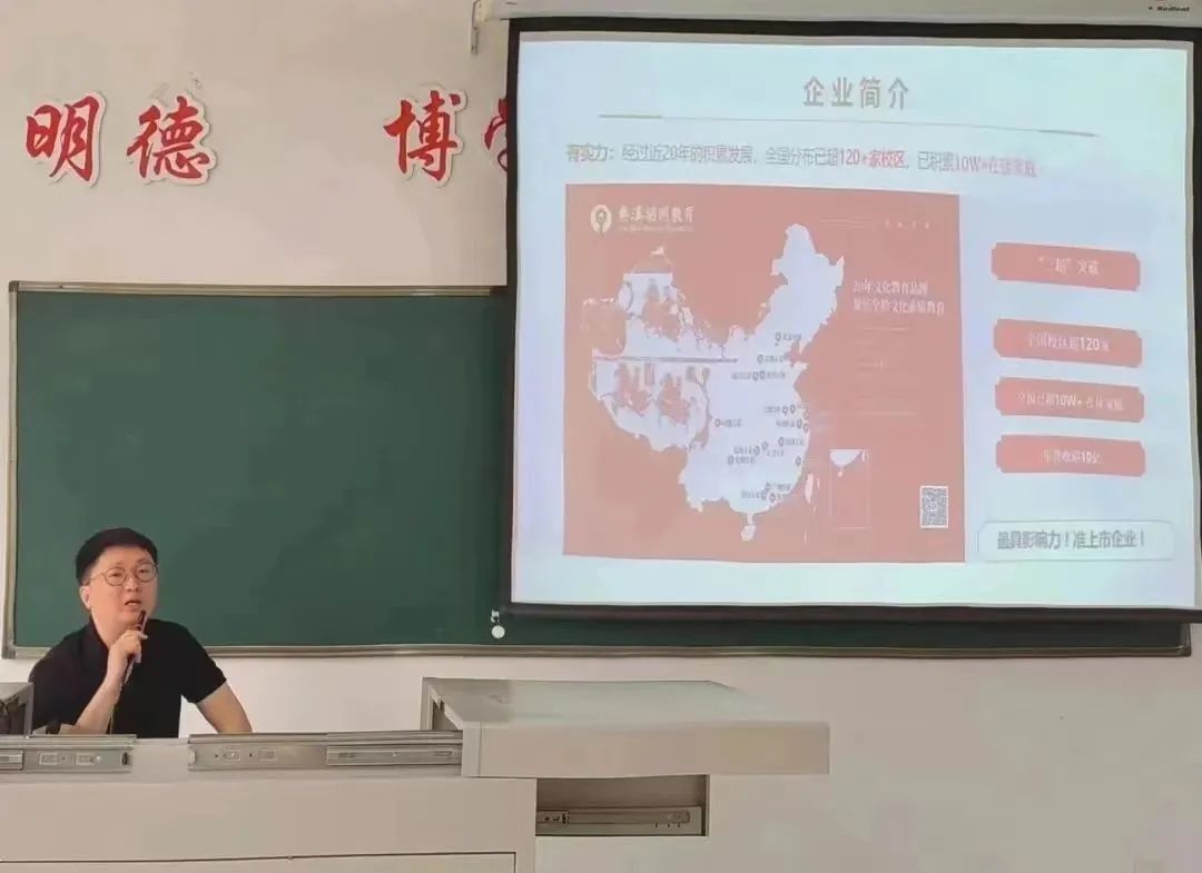 在宣讲会上,赵健老师首先就企业的品牌文化、经营规模、对外交流三个方面展开详细介绍,让同学们对秦汉胡同教育的基本情况有了初步认识。随后,他为同学们重点分析了招聘岗位的工作内容、入职安排和薪资待遇问题,便于同学们进一步了解秦汉胡同教育的员工培养机制和薪酬管理制度。最后,赵健老师对企业的用人要求和应聘流程进行了细致说明,鼓励同学们尽快明确职业目标定位,在更高更大的平台上锻炼能力、提升自己。