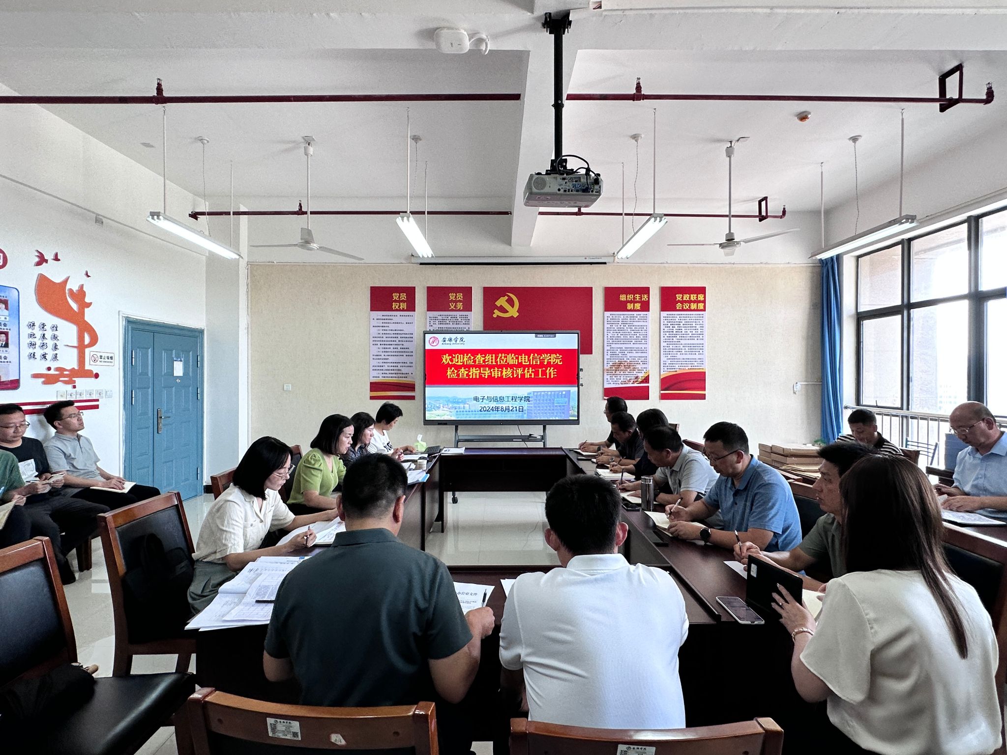 8月21日-8月25日,学校党委书记、校长钟生海,党委副书记、纪委书记、监察专员安永强,党委副书记张东红、余谦,副校长屈险峰、崔晓明和部分职能部门负责人、二级学院院长组成四个专项检查组,对12个二级学院、24个职能部门暑假期间审核评估自查整改工作情况进行督导检查。