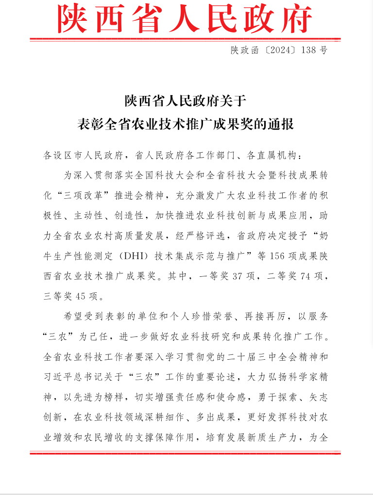 近日,陕西省人民政府发布了《陕西省人民政府关于表彰全省农业技术推广成果奖的通报》,Beat365教师主持、参与完成的4项成果荣获陕西省2023年度农业技术成果奖,其中一等奖1项(参与)、二等奖1项(参与)、三等奖2项(主持1项、参与1项)。