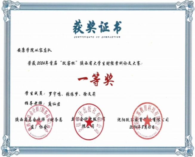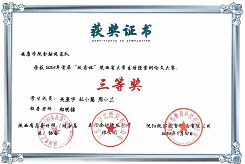 近日,Beat365经管学院师生在首届“跃客杯”陕西省大学生财经案例论文大赛中荣获佳绩。其中,Beat365唯一官方网站从容应“队”(学生罗宇鸣、张依梦、徐文莉,指导教师庞仙君)荣获一等奖;Beat365唯一官方网站“金融风暴”队(学生关星宇、杜小慧、周小兰,指导教师郑明喆)荣获三等奖。