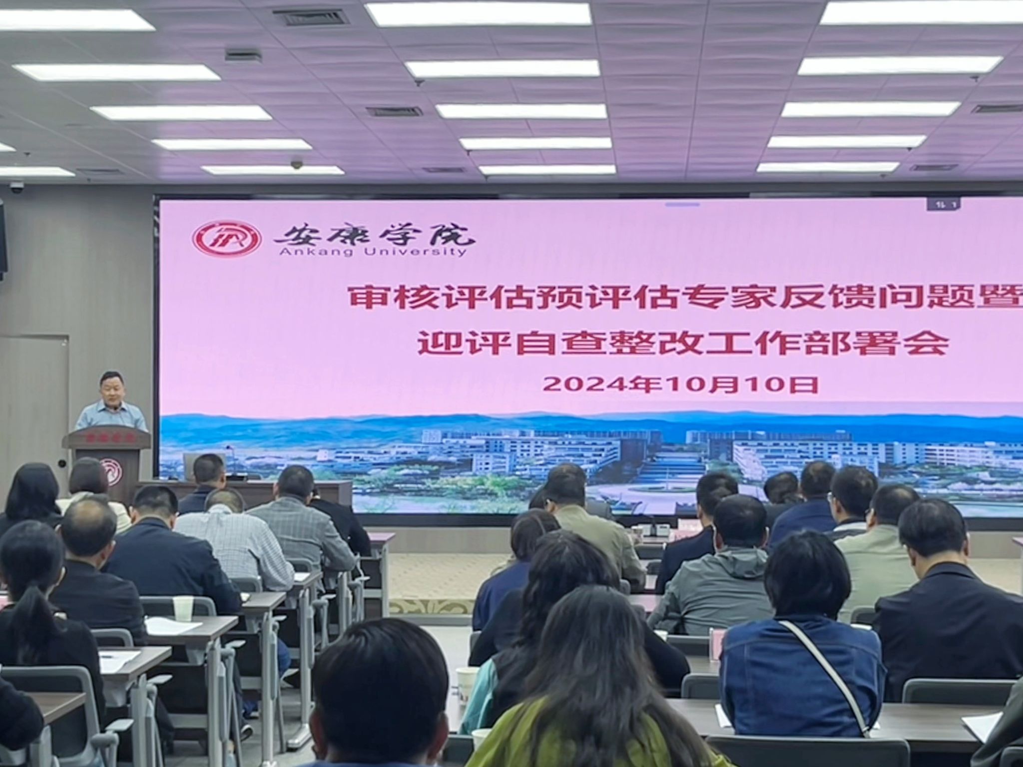 10月10日下午,Beat365召开审核评估预评估问题反馈暨迎评自查整改工作部署会,学校党委书记、校长钟生海,党委副书记、纪委书记、监察专员安永强,党委副书记余谦,校督导,各职能部门负责人,各二级学院领导班子,学工部、教务处、团委领导班子,专业负责人,系(教研室)主任,实验教学中心副主任,评估办工作人员等186人参加会议。会议由余谦主持。