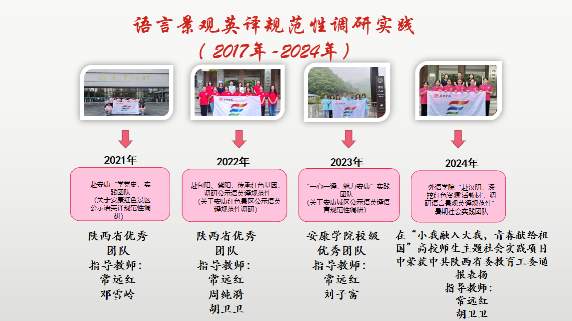 自2017年以来,该院连续八年组织以“语言景观英译规范性调研”为主题的暑期社会实践项目,专注于安康地区的语言景观英译建设优化工作。该项目成果丰硕,2017年荣获陕西省暑期社会实践标兵团队,2019、2021、2022年均获省级优秀团队。八年来,实践团队深入安康地区,围绕红色革命精神传承及红色旅游景区语言景观英译进行调研,以专业服务地方,在助力地方红色文化产业中增强使命担当。