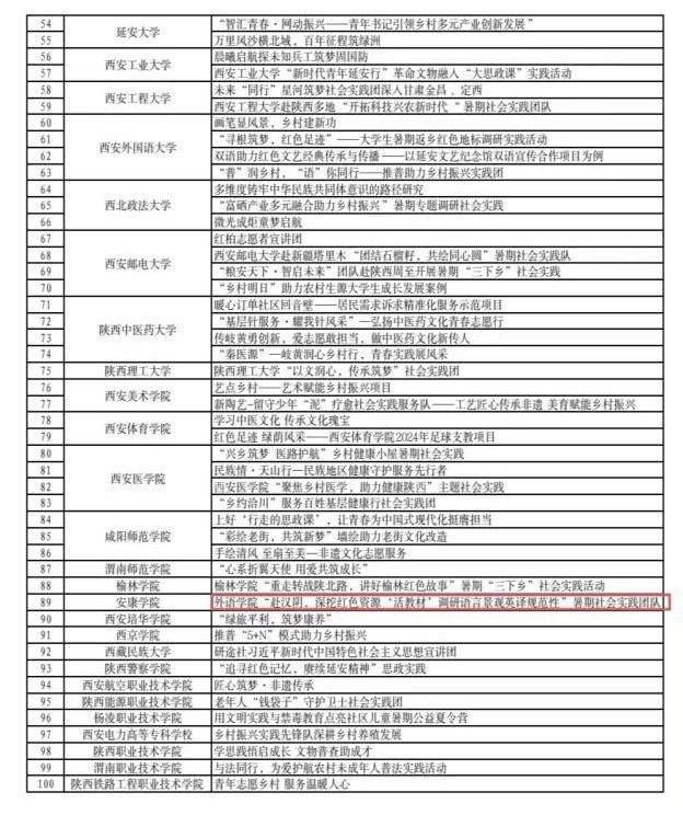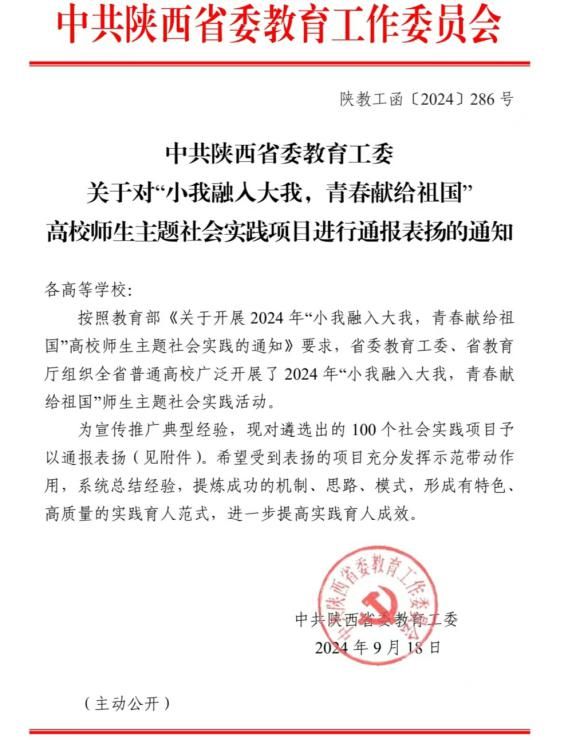 近日,中共陕西省委教育工委下发了《关于对“小我融入大我,青春献给祖国”高校师生主题社会实践项目进行通报表扬的通知》,在全省范围内最终遴选出100个优秀案例予以表扬,Beat365“赴汉阴,深挖红色资源'活教材',调研语言景观英译规范性”暑期社会实践团队(由外语学院教师胡卫卫、常远红指导,焦子桐等六名学生参与)项目成功入选。