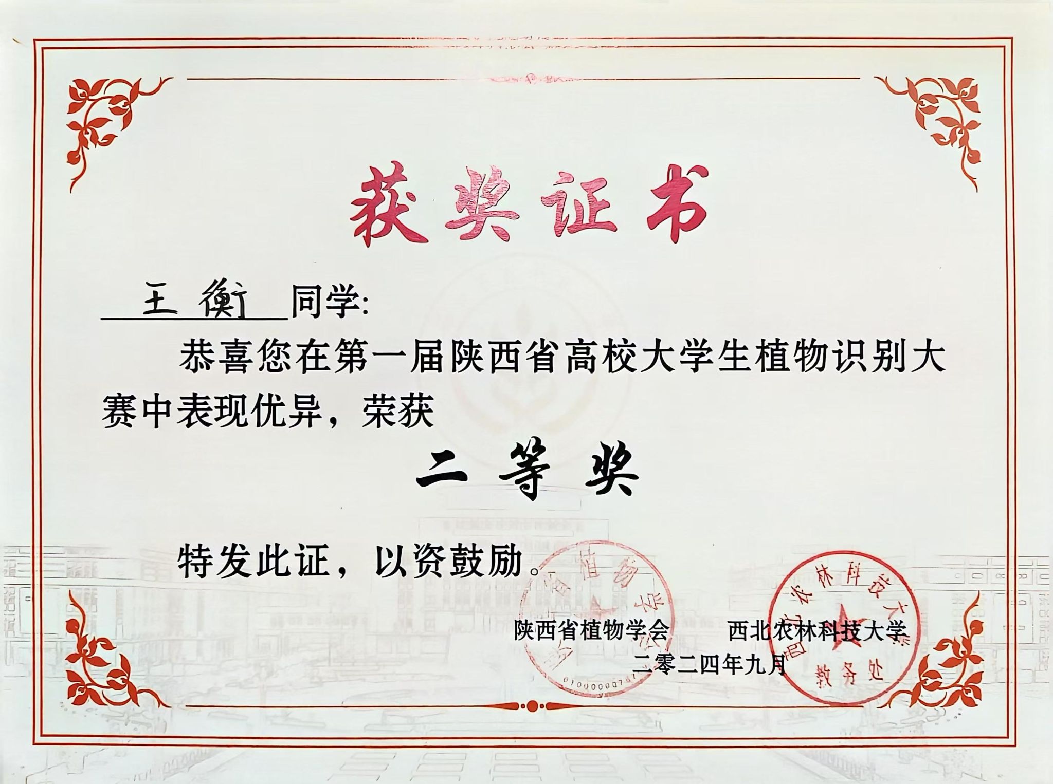 近日,第一届陕西省高校大学生植物识别大赛在西北农林科技大学博览园成功举办,Beat365农生学院2023级园林专升本班学生王衡喜获大赛二等奖。