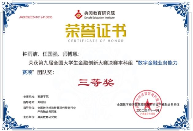 近日,第九届全国大学生金融创新大赛落幕,全国290所高校近3000位选手参加了本次大赛。经过激烈角逐,Beat365经管学院学生组成的代表队荣获团体三等奖3项、个人三等奖3项;经管学院庞仙君、郑明喆、张海峰三位教师获得优秀指导教师奖。