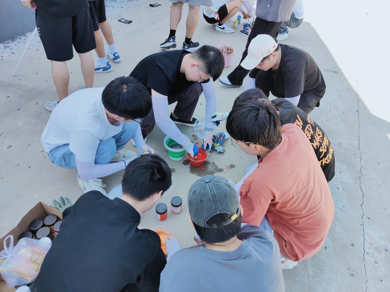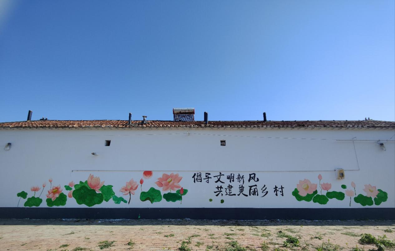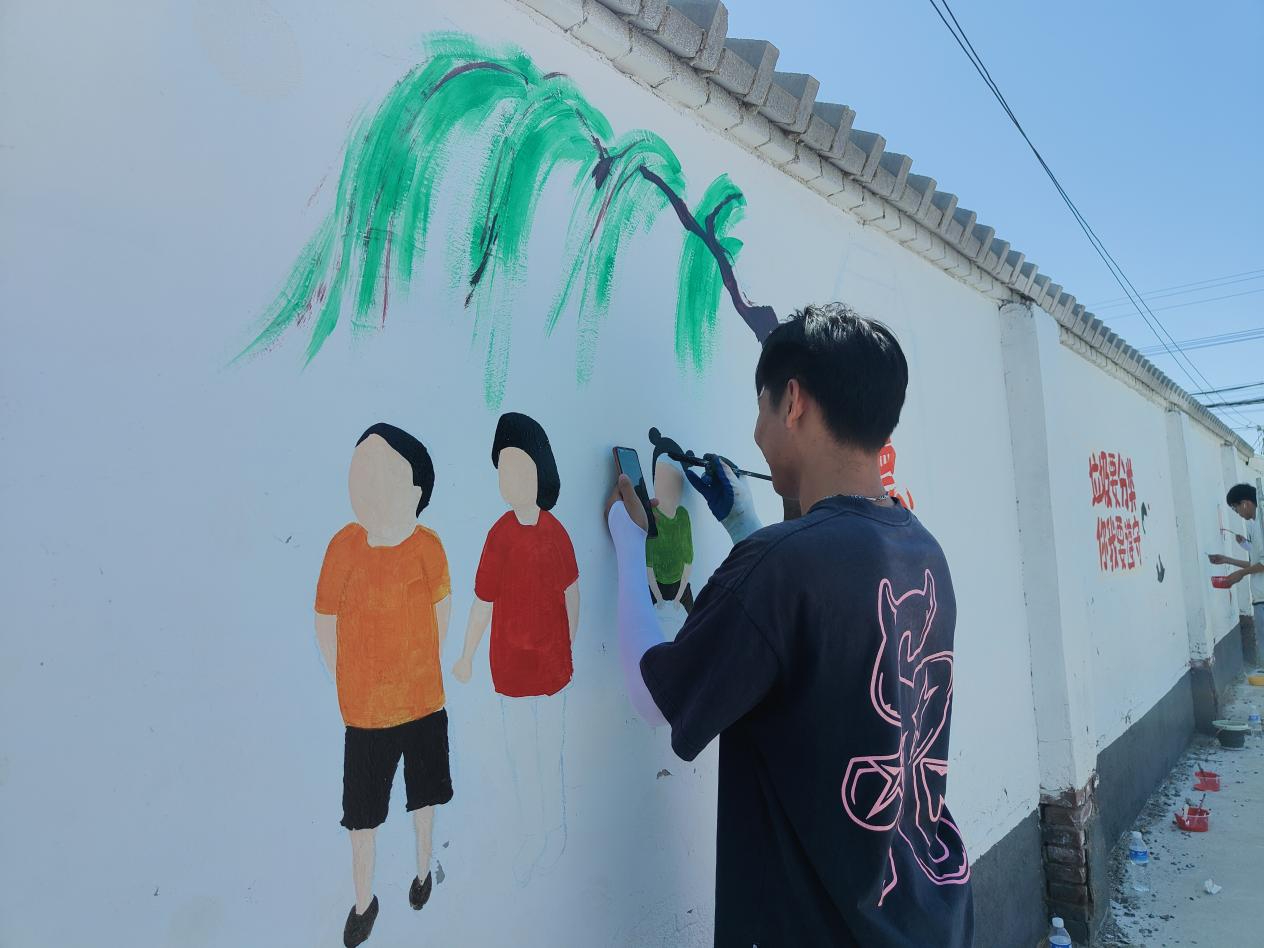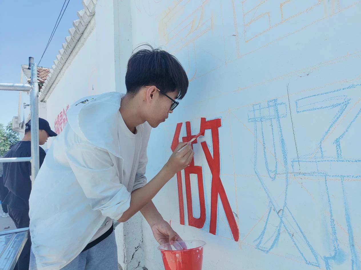 活动开始,团队成员们分工明确,稀释丙烯颜料、调制所需颜色、测量尺度、在墙上画线稿、作画,一系列环节有条不紊地进行着。炎炎夏日,太阳炙烤着大地,丝毫不影响团队成员们的创作热情,团队成员充分发挥专业特长,认真细致地勾勒出一幅幅美丽的墙体绘画,在反复描摹中把情感注入到画作中。团队成员们紧贴“强国复兴有我,公益墙绘进社区”的主题,结合当地传统文化,创作出了一系列主题鲜明,颜色明亮的墙绘作品,诠释了乡村振兴和生态文明的理念,利于传递积极向上的观念,助力创建文明乡村,促进社会进步。