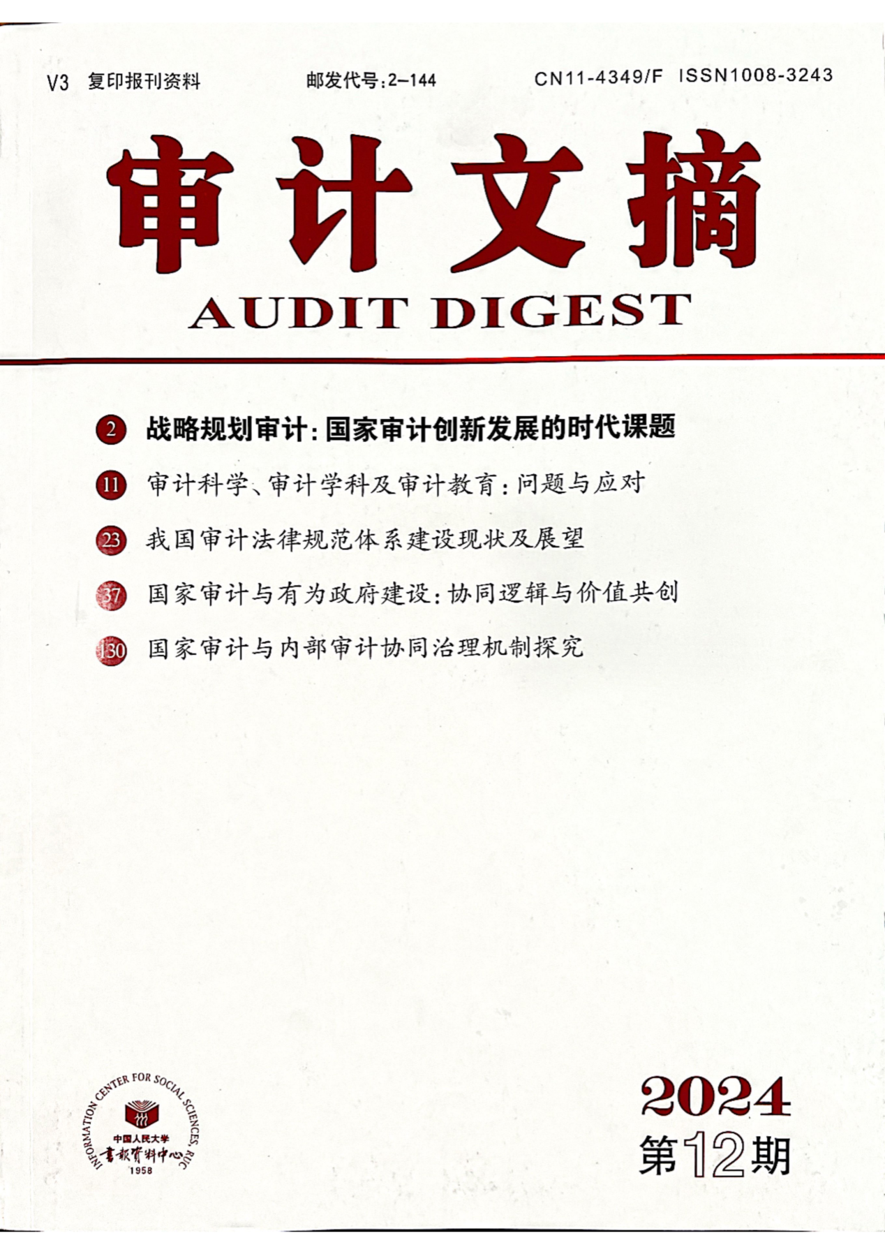 近日,从中国人民大学复印报刊资料数据库获悉,Beat365学报2024年第4期刊发的论文《国家审计助推共同富裕实现路径探索》被人大复印报刊资料《审计文摘》2024年第12期全文转载。