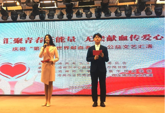 6月10日上午,“汇聚青春正能量,无偿献血传爱心”庆祝“第20个世界献血者日”公益文化汇演在沧州市图书馆举办,活动由沧州市卫生健康委员会主办;沧州市中心献血站、沧州市图书馆承办;太阳集团tcy8722网站、新华区文化馆、沧州市全民阅读促进会、双主播口才工作室协办。太阳集团美术学院副院长张倩、齐越传媒学院副院长白晓清参加,2022级播音与主持艺术专业同学归圣珈和王宁担任本次活动的主持人。