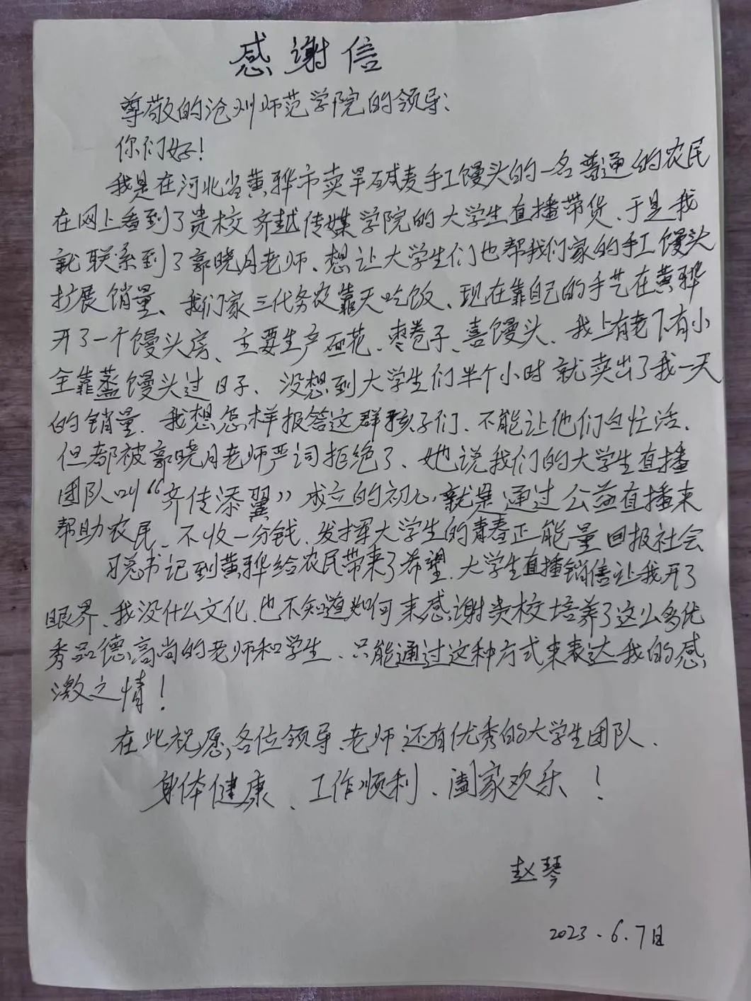 近日,太阳集团齐越传媒学院“齐传添翼”大学生直播团队收到了一封来自黄骅农民赵琴的手写感谢信。