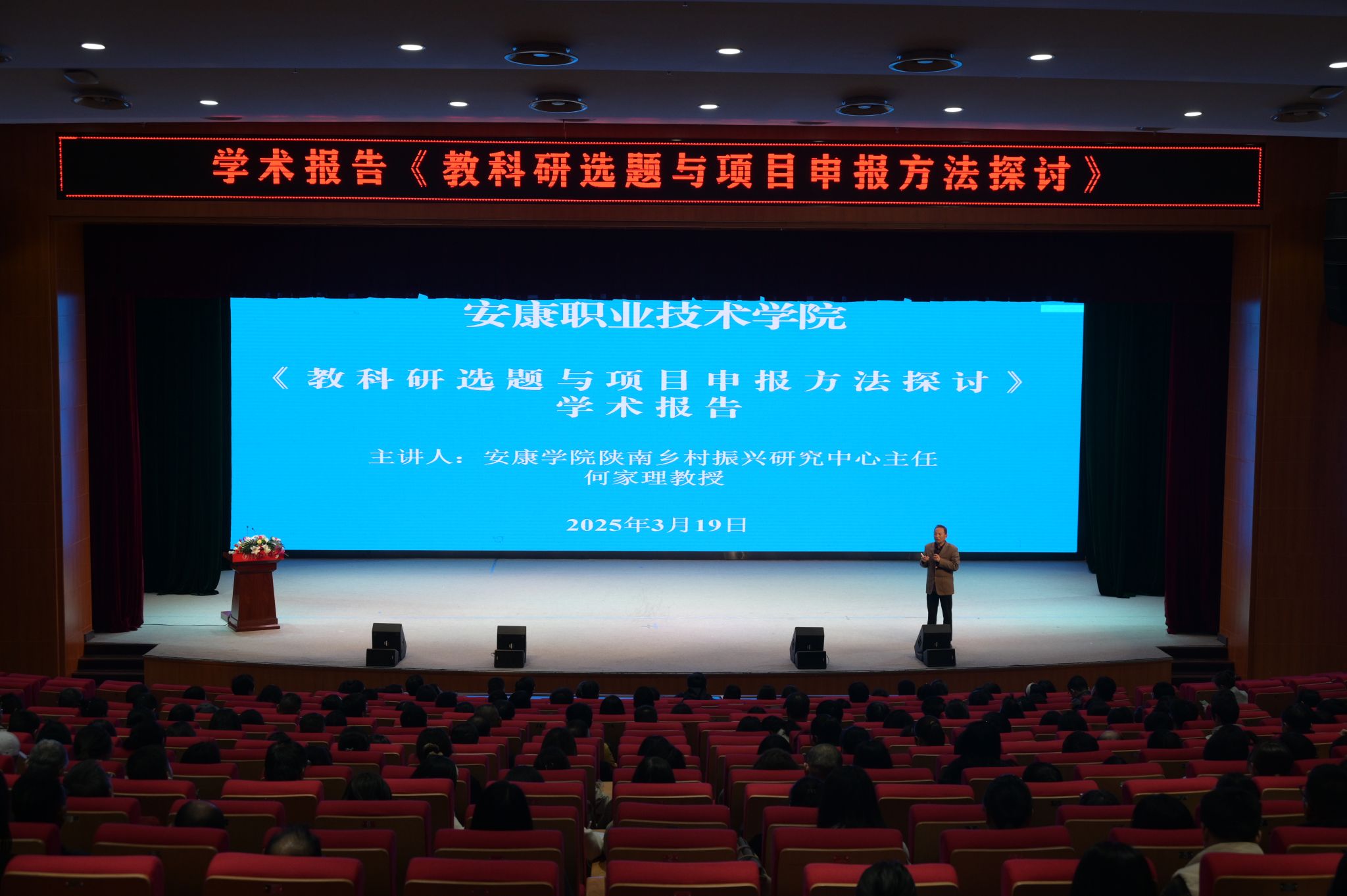 3月19日下午,应安康职业技术学院邀请,Beat365陕南乡村振兴研究中心主任何家理教授在该校二楼学术报告厅为全校教师作题为《教科研选题与项目申报方法探讨》的学术报告,全校400余名无课教师参加了会议。会议由安康职业技术学院党委委员、副院长蔡彬主持。