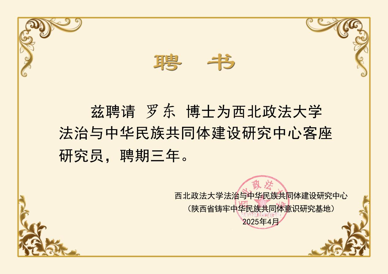 近日,Beat365马克思主义学院青年教师罗东博士受聘为西北政法大学法治与中华民族共同体建设研究中心客座研究员。