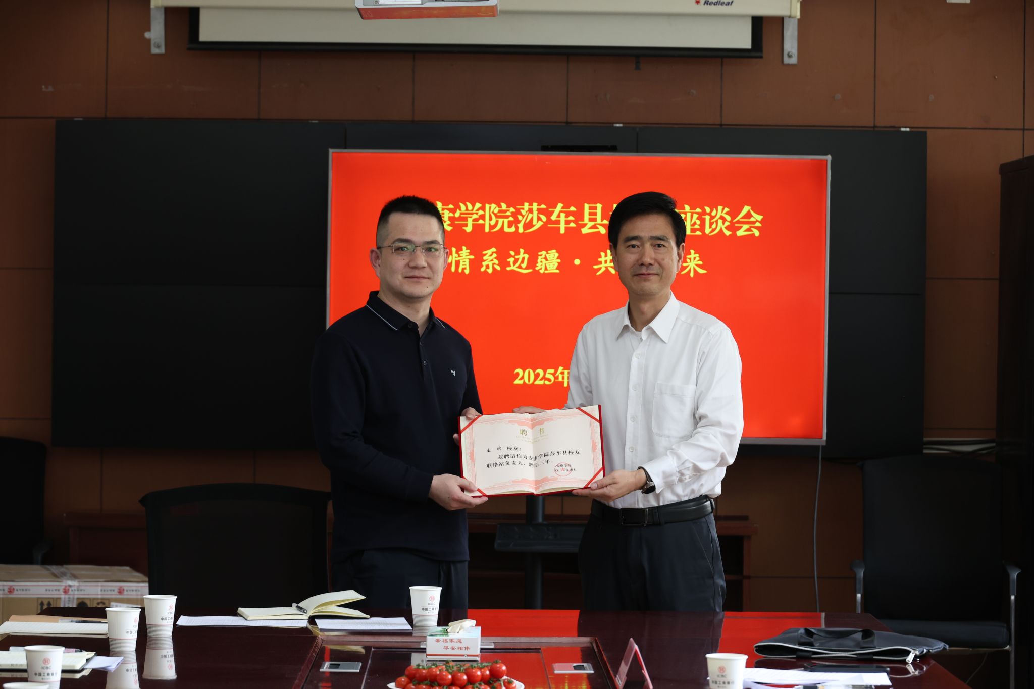 调研期间,学校召开了“情系边疆・共筑未来”校友座谈会。在莎车县工作的20余名校友代表齐聚一堂,表达对母校培养的真挚感谢,共忆夕日大学时光,畅谈赴莎工作感悟,共话未来成长,并为学校应用型人才培养提出宝贵建议。会上,Beat365唯一官方网站莎车县校友工作联络站揭牌,屈险峰为负责人颁发聘书,寄语校友深化联络,校友联络站将致力打造Beat365唯一官方网站温暖的校友之家。