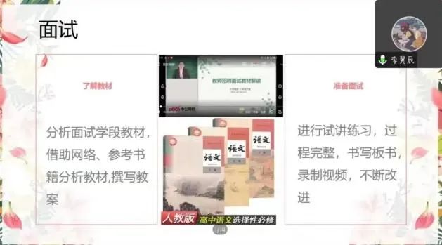 1.召开“教师编考试经验交流会”,邀请就职于沧州、唐山、雄安新区等地中小学的2022届毕业生——李翼辰、徐畅、李萌萌、肖莹,就如何通过教师编招聘考试为毕业生做具体指导;举办“华文杯”师范生教学能力大赛获奖课例展示,通过典型示范,帮助毕业生做好应聘中的试讲准备。