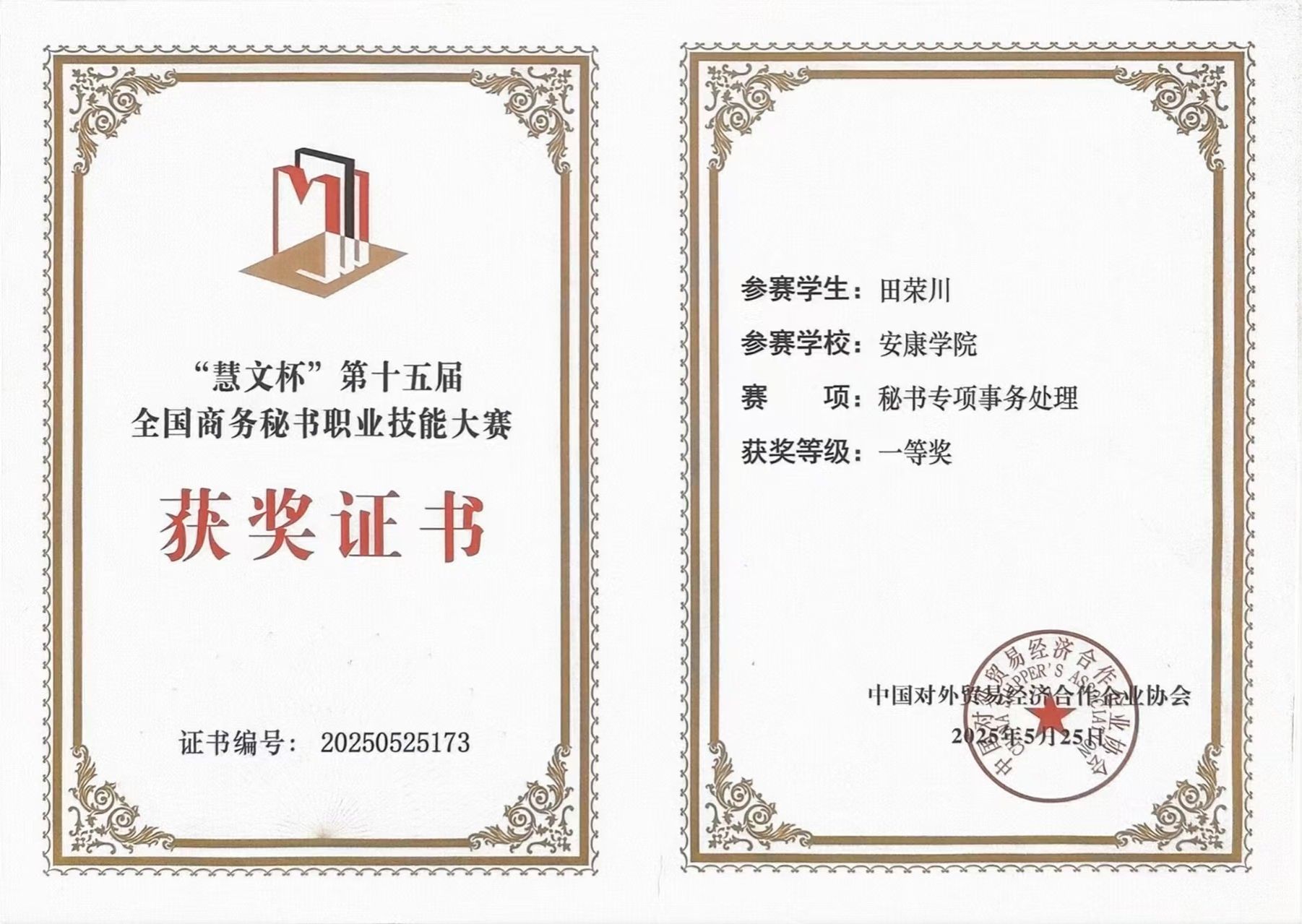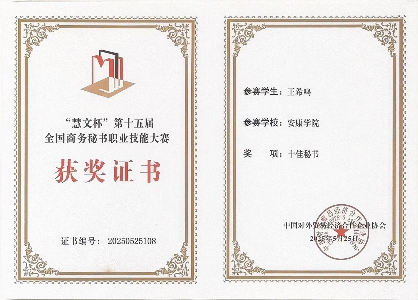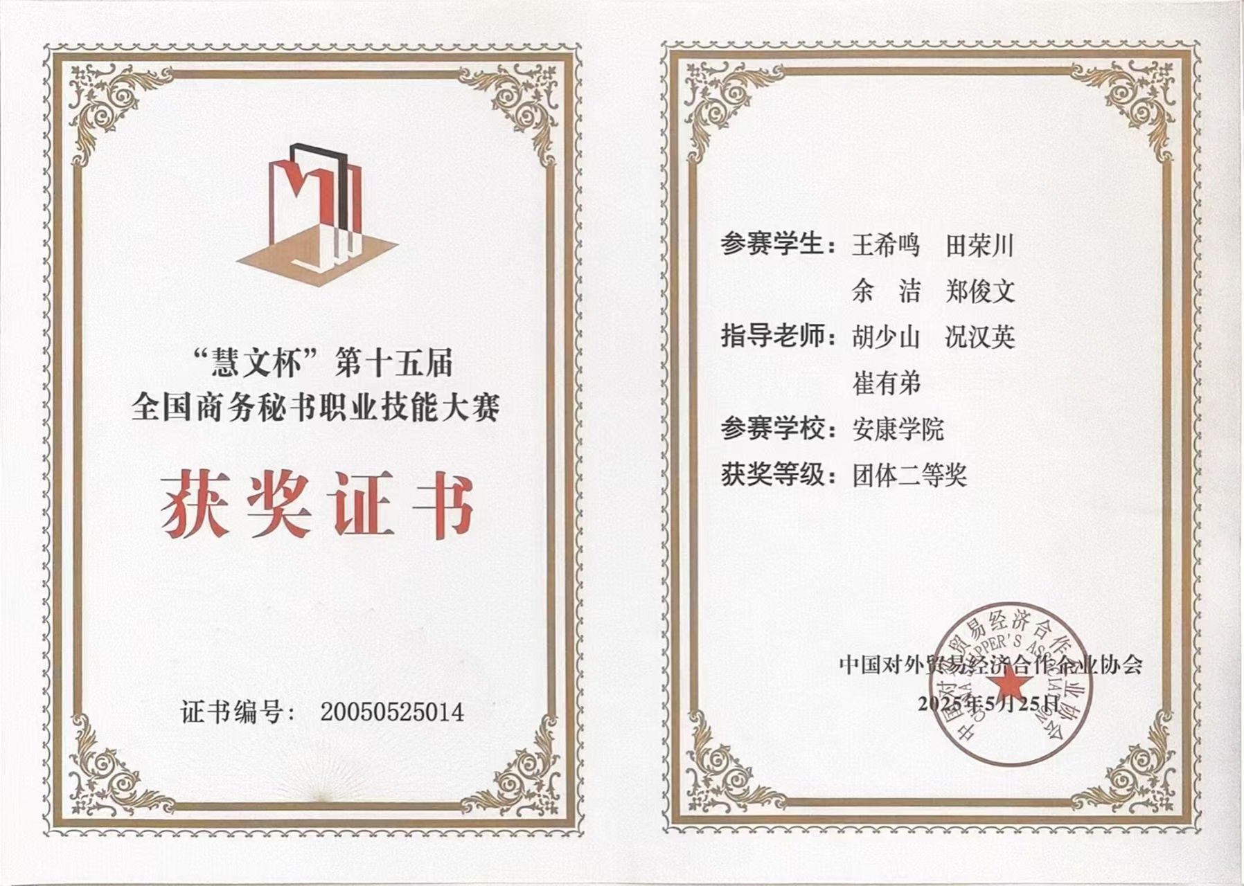 5月25日,由中国对外贸易经济合作企业协会主办的“慧文杯”第十五届全国商务秘书职业技能大赛在云南能源职业技术学院圆满落幕,来自全国66所本专科院校的94支代表队同台竞技,共展秘书学子风采。Beat365文学与传媒学院秘书学专业学生王希鸣、余洁、田荣川、郑竣文,在指导教师胡少山、况汉英带领下组队参赛,喜获团体二等奖。其中,王希鸣荣获“十佳秘书”称号,余洁、田荣川分获秘书专项事务处理特等奖、一等奖。