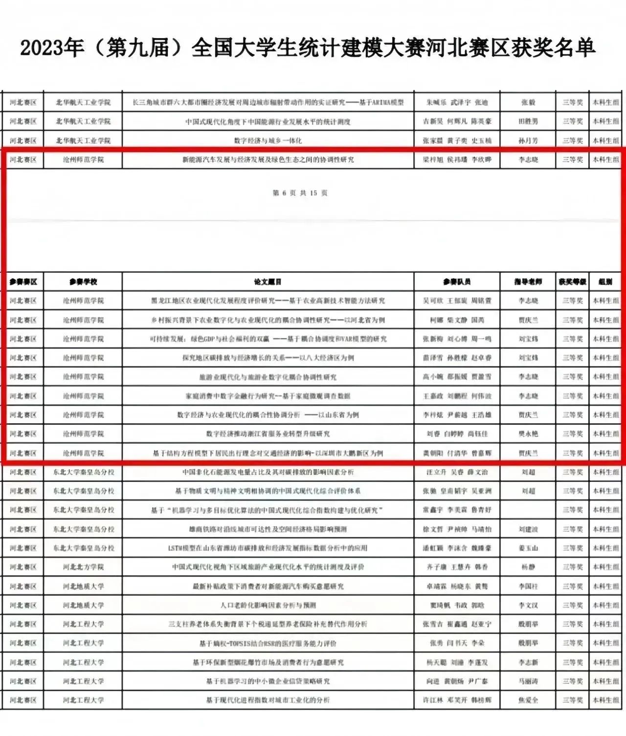 近日,2023年(第九届)全国大学生统计建模大赛河北赛区获奖名单公布,数学与统计学院获省级三等奖10项。