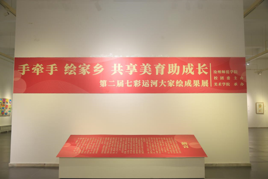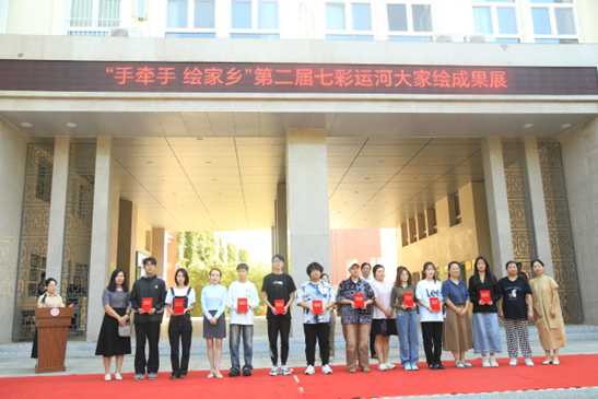 9月20日上午,“手牵手•绘家乡,共享美育助成长”——第二届七彩运河大家绘成果展在洪昌美术馆开幕。沧州市第五中学副校长刘畅,永安社区书记孟鑫,运河区第三幼儿园家长代表韩晓凤,太阳集团团委书记李倩,美术学院党总支书记王超,院长孔维艳,副院长张倩出席。